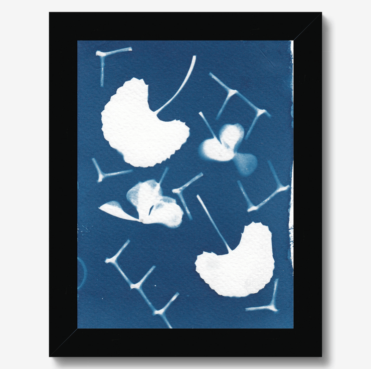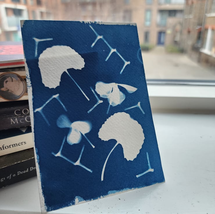 Original cyanotype, around A6 on Canson watercolour paper. Cyanotypes are also called sunprints, because in the process, paper is coated with a photosensitive chemical and exposed to sunlight with a negative on it.