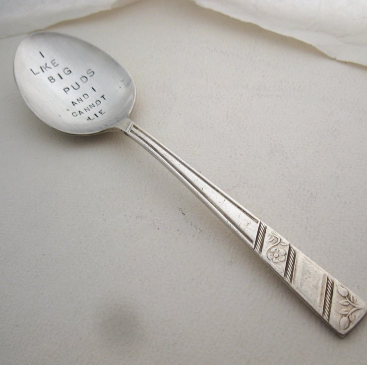 A hand stamped dessertspoon with the wording I LIKE BIG PUDS AND I CANNOT LIE - perfect for tucking into Xmas or other puds!