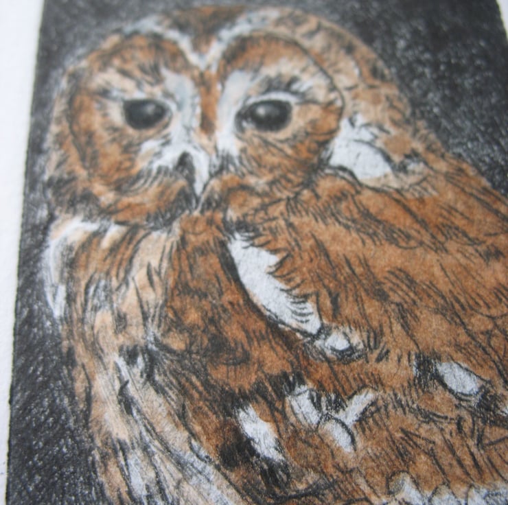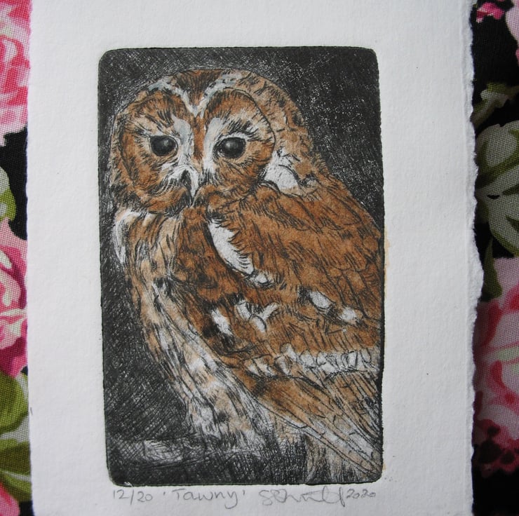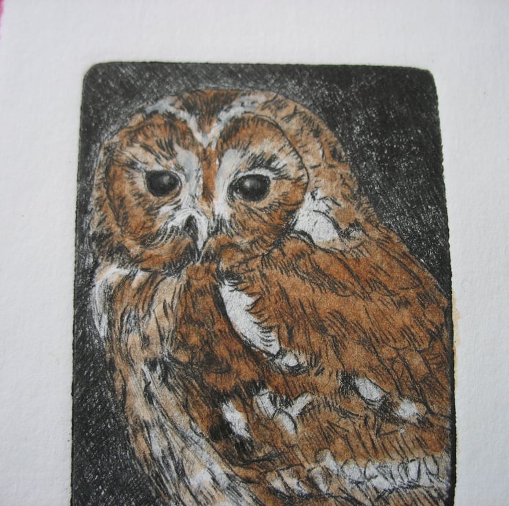 This little cuteypie measures approximately 2"x3" . It is a drypoint etching taken from a plexiglass plate which has been scratched into with a fine tool and printed with Akua soya based ink. She is numbered 12 from a limited edition of 20 prints and is coloured with watercolour.