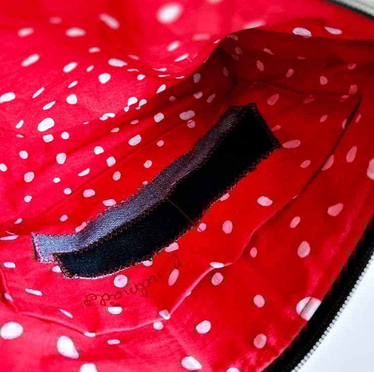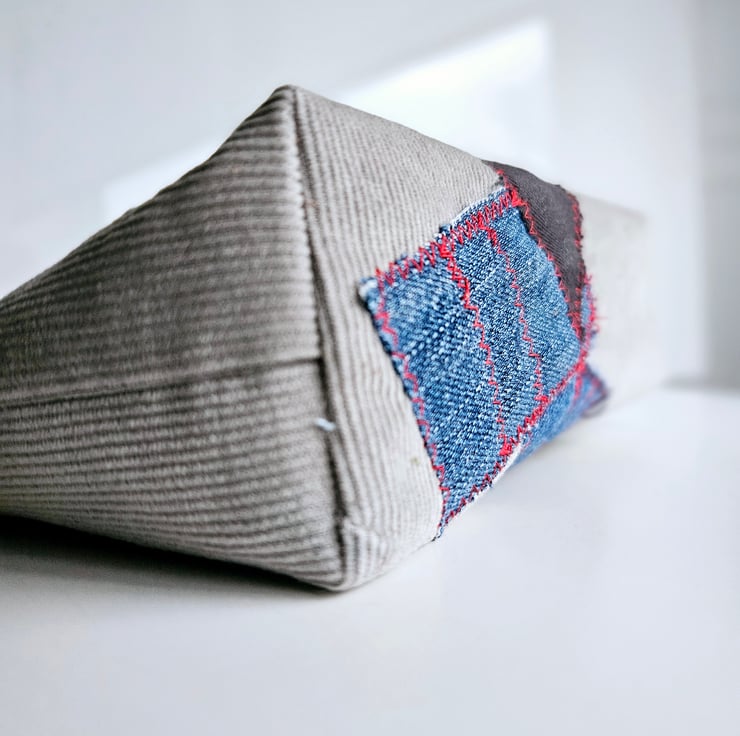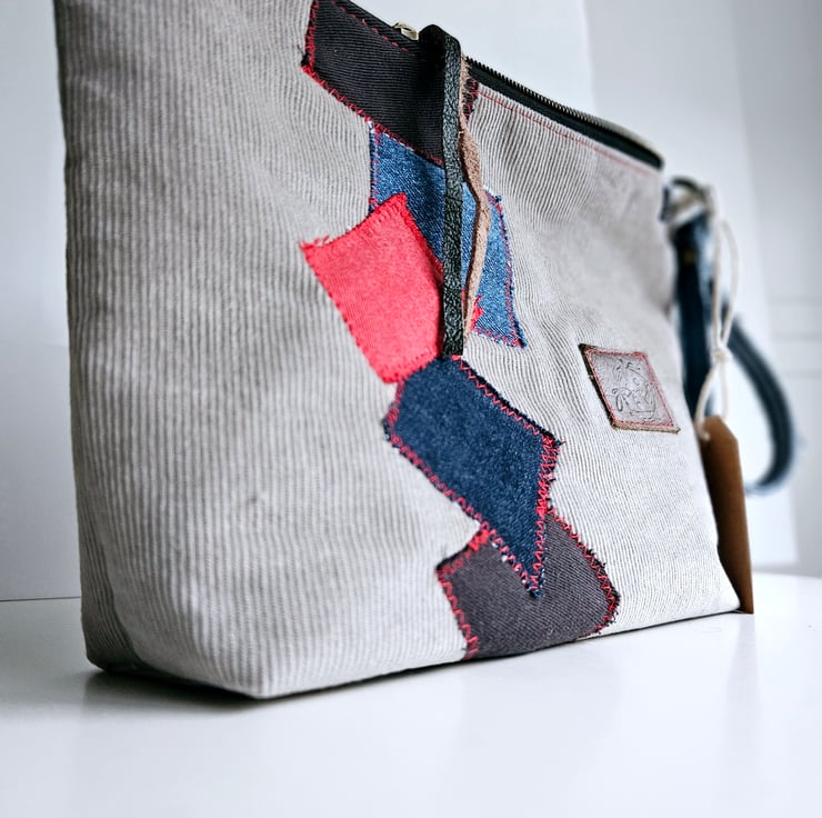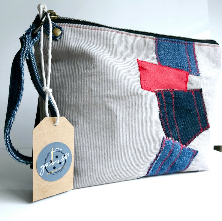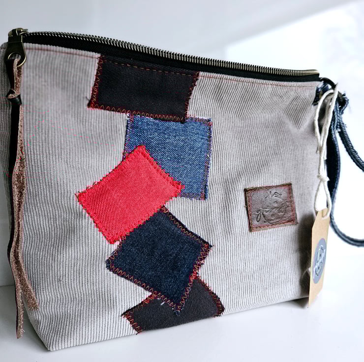 The patches on the pouch are made from denim leftovers, giving it a unique and eco-friendly touch.