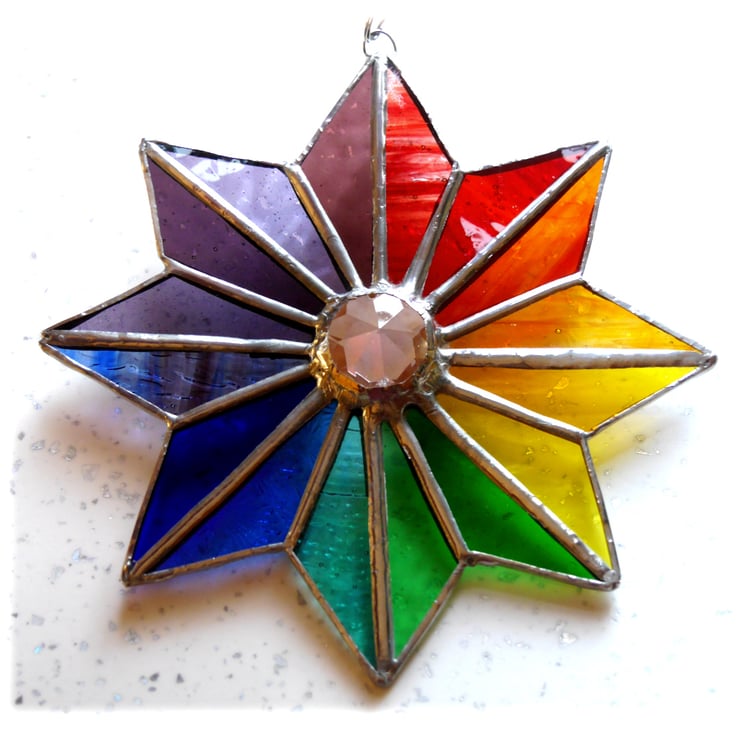 The suncatcher is 15cm in diameter and hangs from a silvery chain which s securely attached by solder to the top.