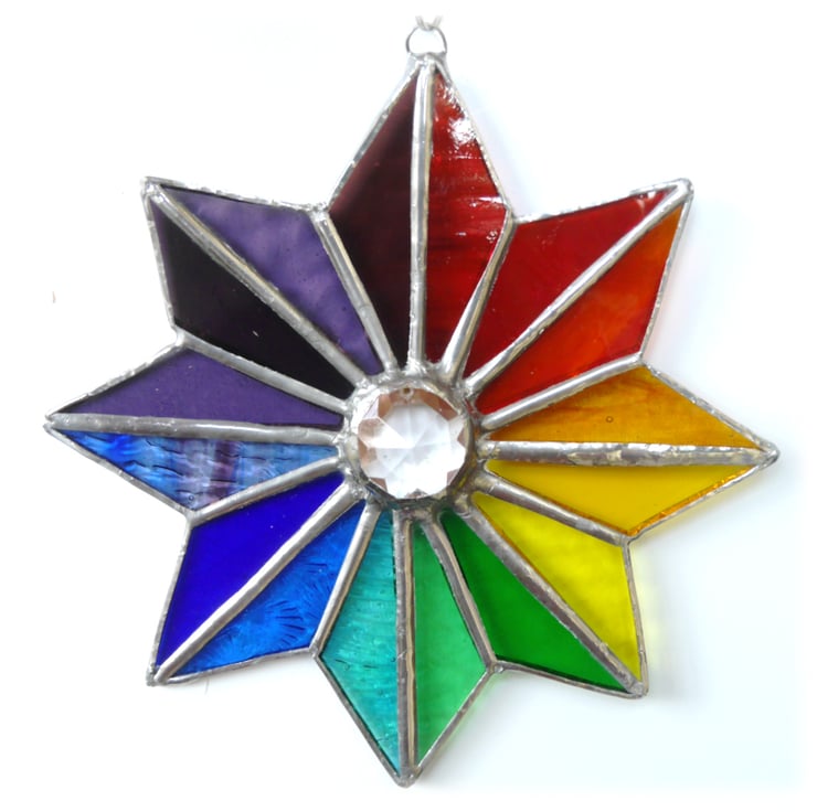 An 8 point star formed from rainbow colours with each point split into a dark / lighter shade of the colour to give a 3-D effect.