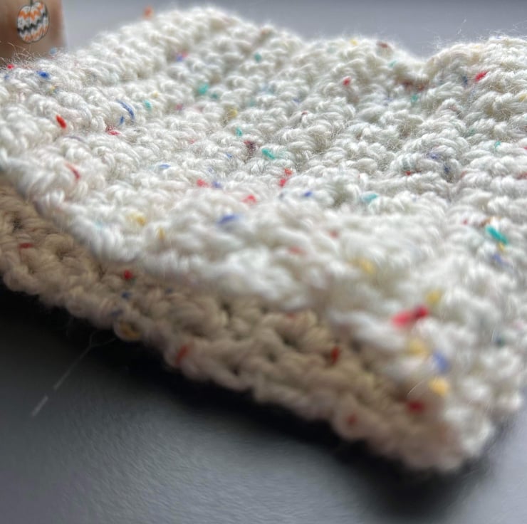 Hand crafted in an acrylic yarn, the speckled flecks of the colours delicately show in the cream background.