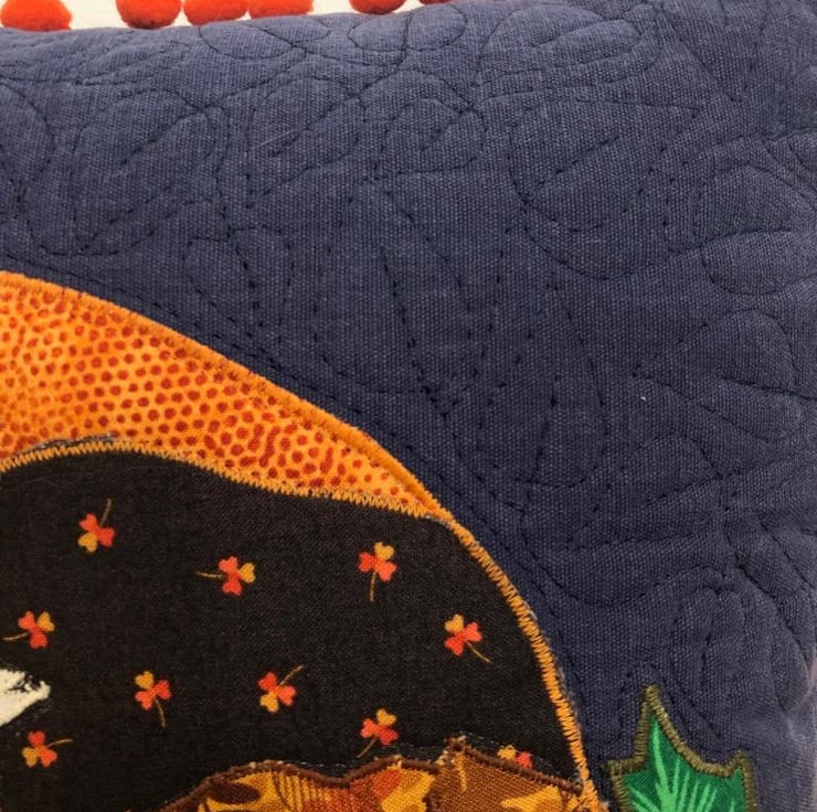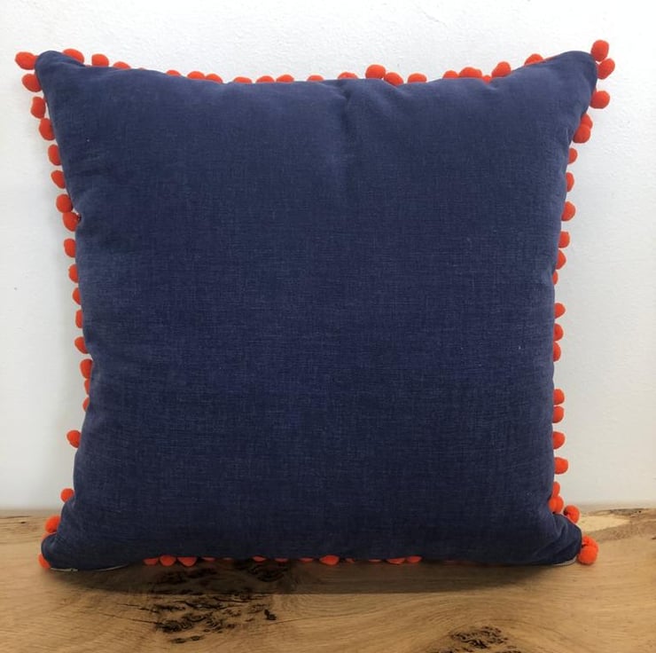 This cushion features a distinctive, unique, design, appliquéd onto a blue brushed cotton backdrop and free-motion quilted for a rich, luxurious texture.