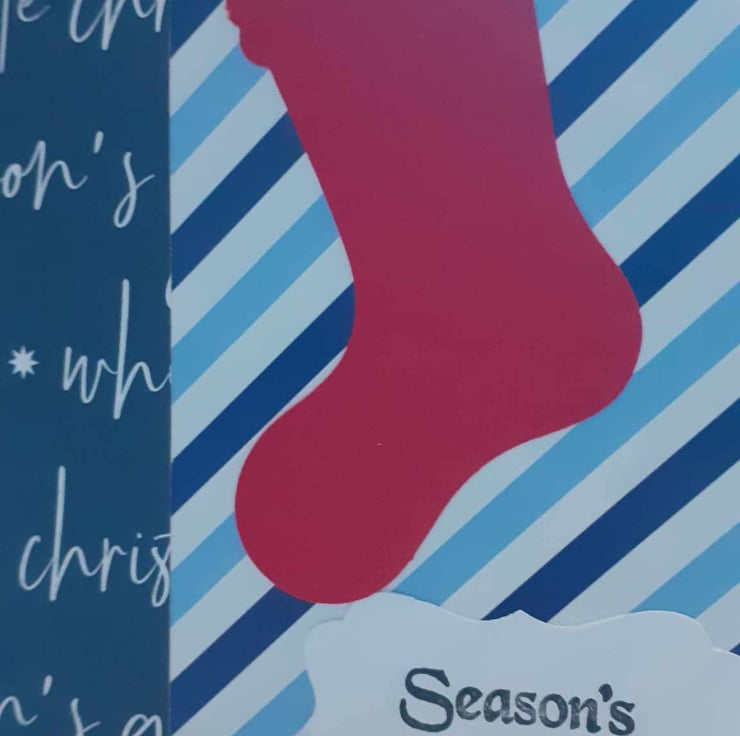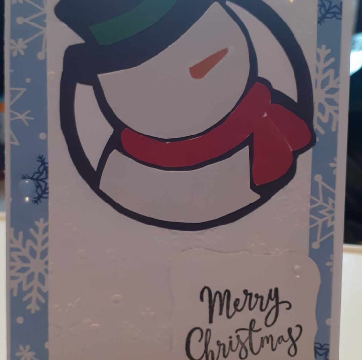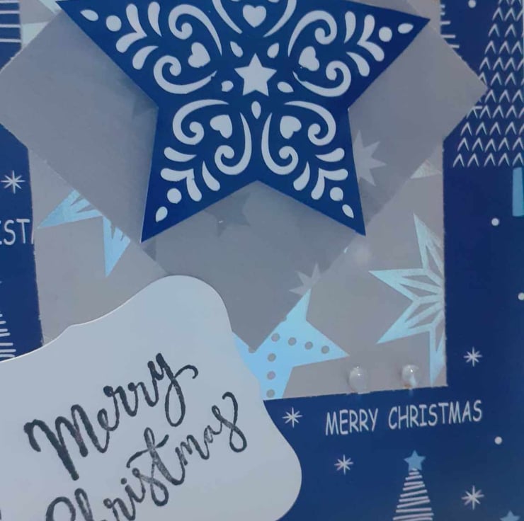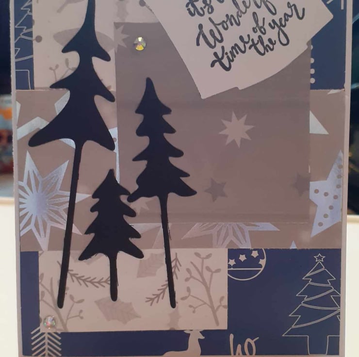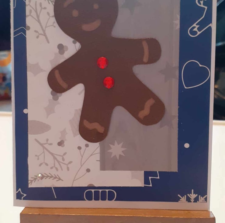 This is a card set with a blue christmas background with different embellishments including: gingerbread man, christmas star, christmas trees, snowman and christmas stocking. The card design is completed by adding diamante's and snow drops.