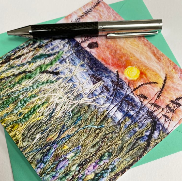 This card is a print of one of my free motion embroidered needle felted stylised sunset landscape of Wrose valley, Yorkshire. It’s blank inside making it ideal for any occasion. The card measures 14.5cm square, comes with a matching envelop in a plastic cover for protection.