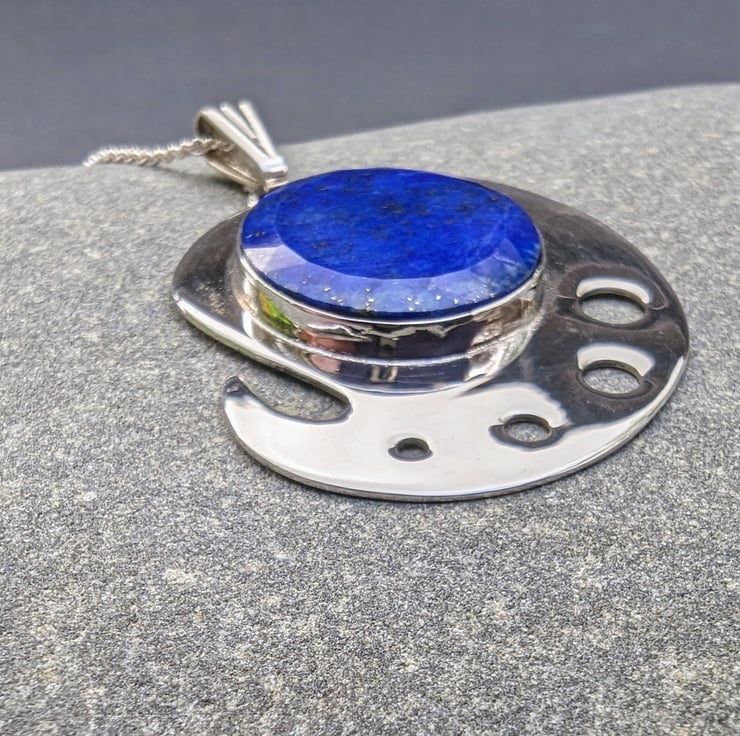 This a unique design using a beautiful blue Lapis Lazuli on a carefully shaped sterling silver back plate with graduated holes and suspended from an 18" sterling silver chain. Overall measurements 1.25" wide x 1.5" long. Hallmarked at Edinburgh Assay Office.