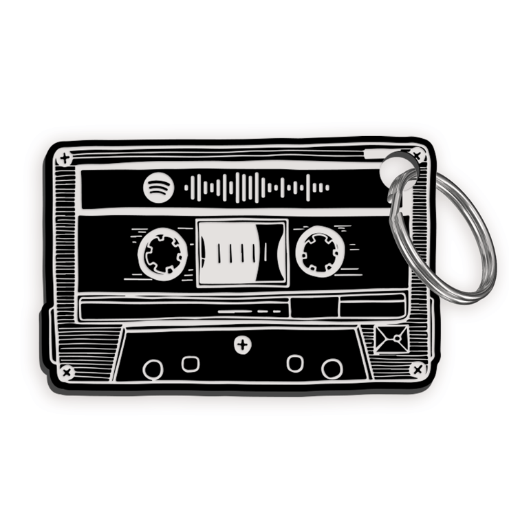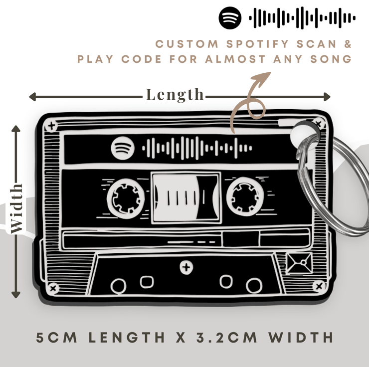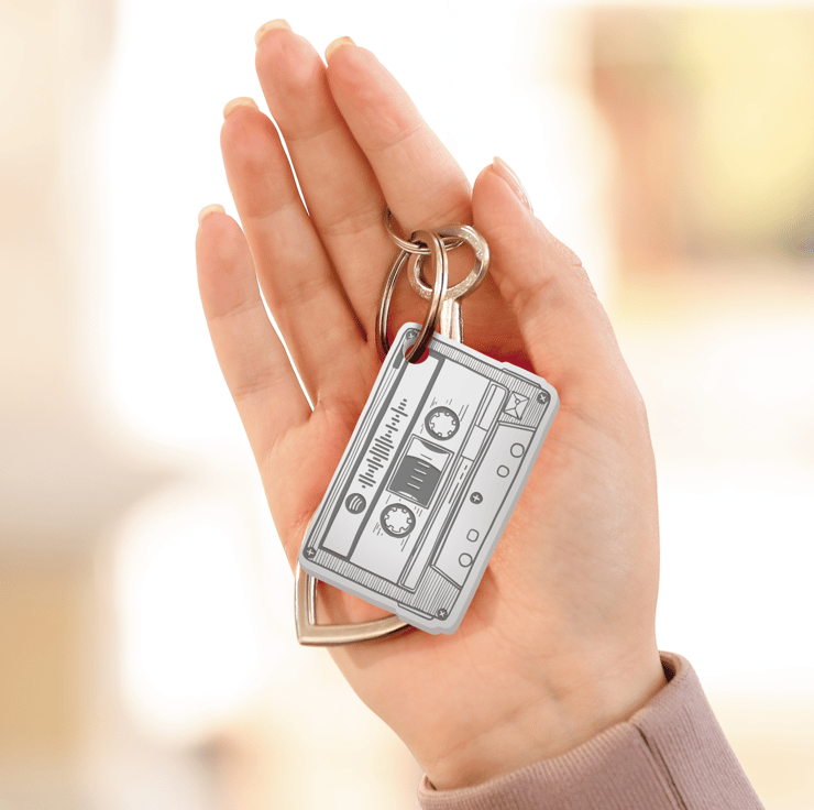 Retro-inspired acrylic cassette keyring that seamlessly blends nostalgia with modern technology. Personalised with a custom Spotify scan code, this keyring allows you to play your chosen song on the go. Elevate your style and share your favourite tunes with this unique accessory that's perfect for music lovers and those who appreciate a touch of vintage charm.