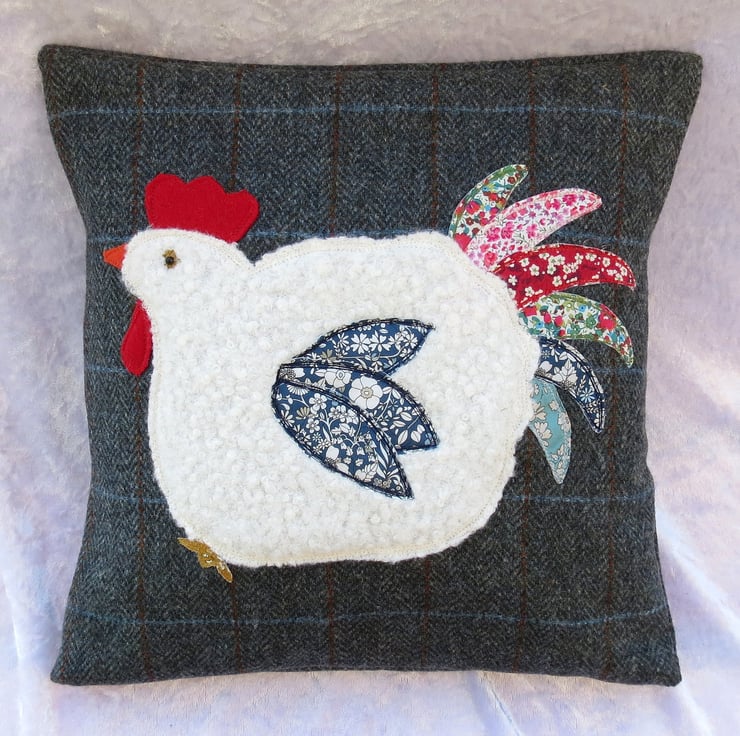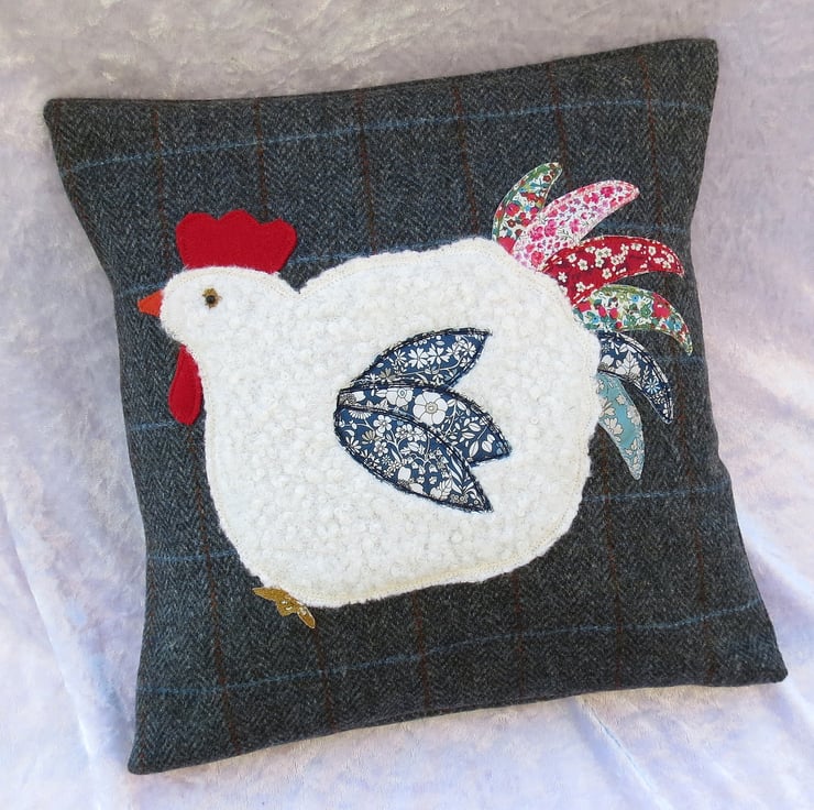 The hen is made from a selection of wool and boucle fabrics, with Liberty Lawn accents.