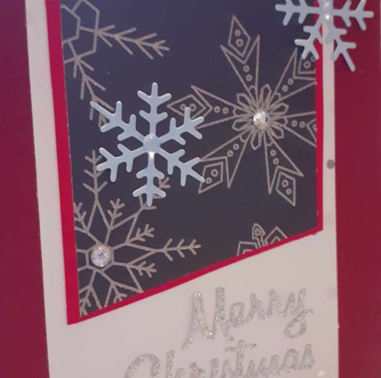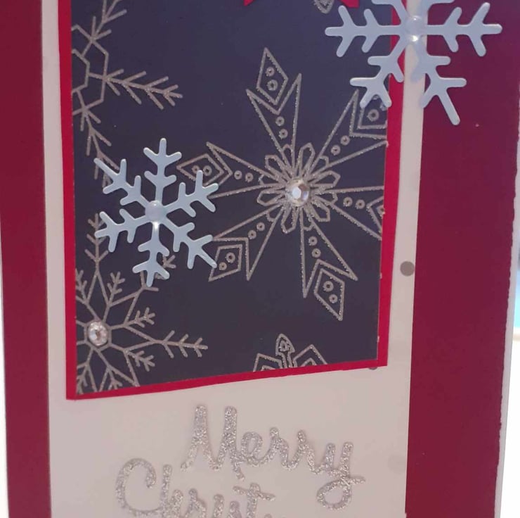This is a unique one-off design to send to loved ones. The card has rounded edges with a blue and red banner. The blue background has silver glitter snowflakes with snowflake and diamante embellishments. The sentiment reads, "Merry Christmas" silver glitter.
