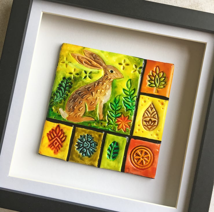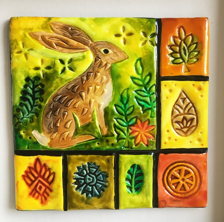 This colourful tile was handmade using polymer clay and then debossed with woodblocks and painted to create a tiled effect.
