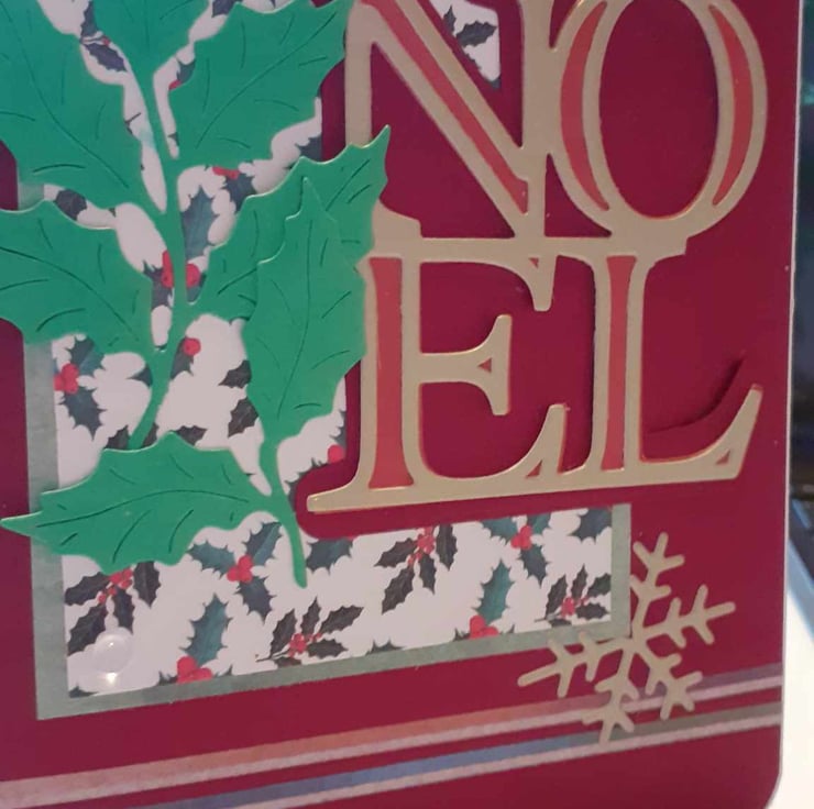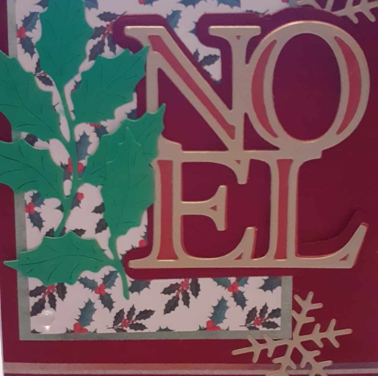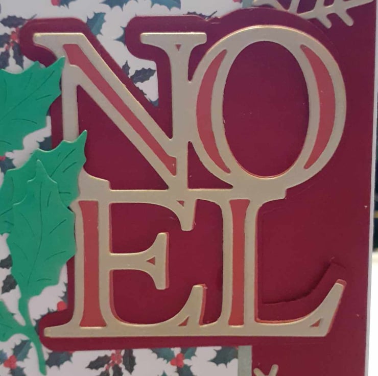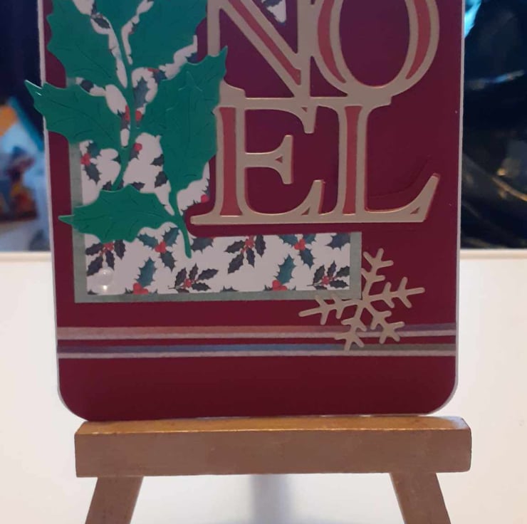 This is a unique one-off card to send to family and loved ones.The card has rounded corners with a red and holly background. The card has gold embossed Noel Letter. The lettering is decorated with green fir leaves with diamante's and glitter to complete the design,