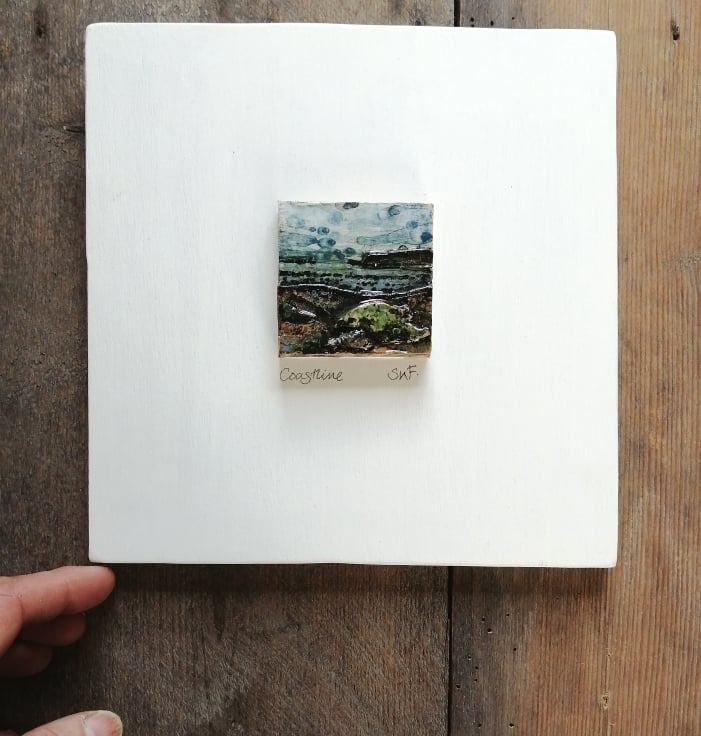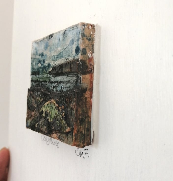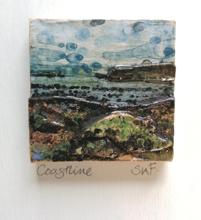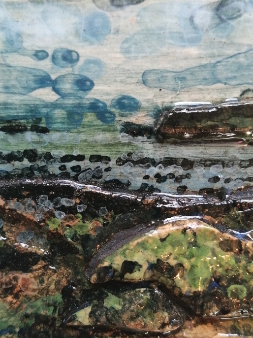 This ceramic, low relief landscape, the smaller version of my larger ones, have been created by applying and layering clay textures, stamping and scratching into the wet clay, before painting liquid clay slips into areas, starting to define areas of sea and sky.