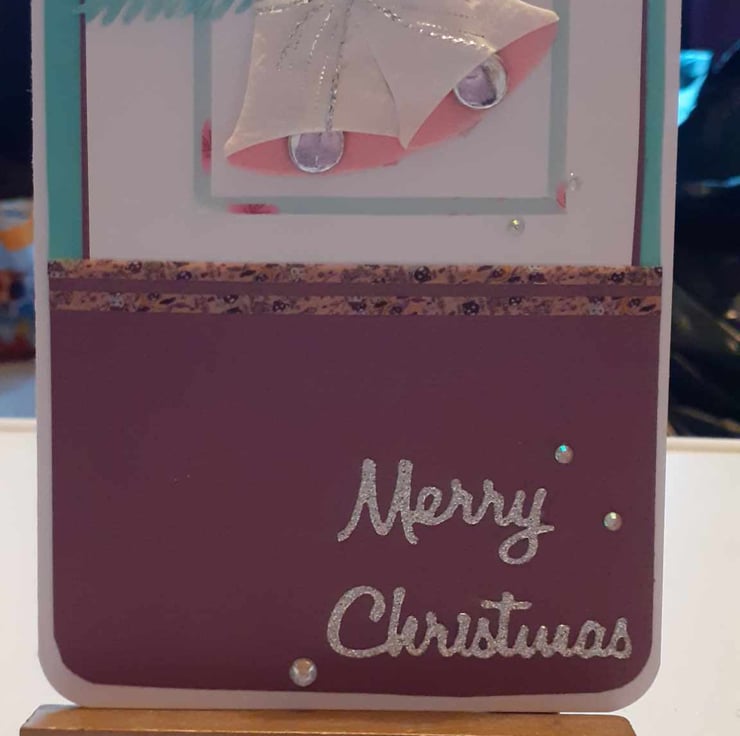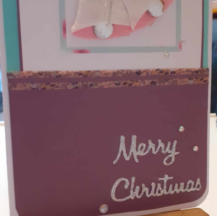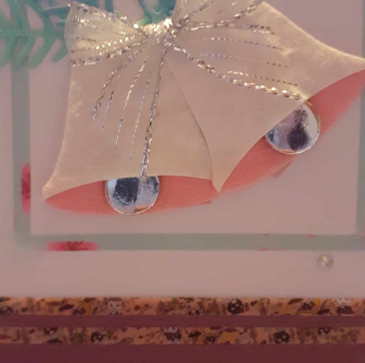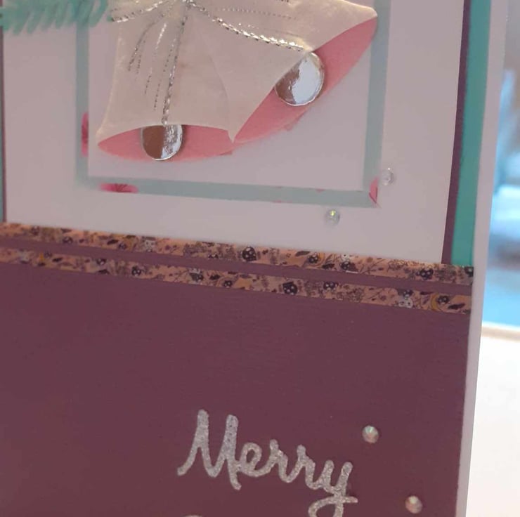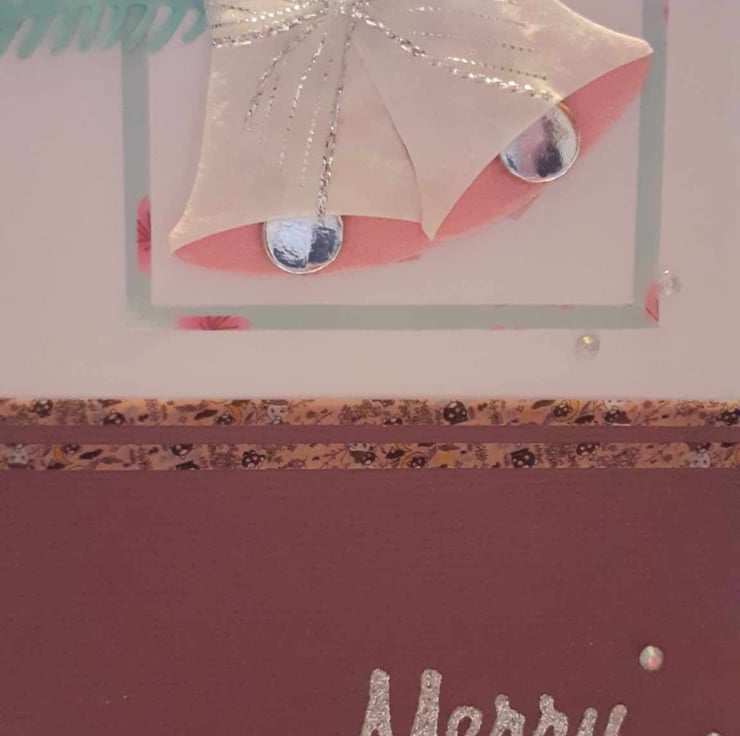 This is a unique one-off card to send to loved ones. The card has rounded corners to give it a vintage feel. The card has a red and backgound with red. The card has silver and pink bells with green fir leaves. There is a sentiment " Merry Christmas" and diamante's finish the design.