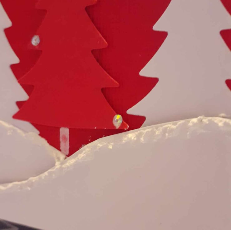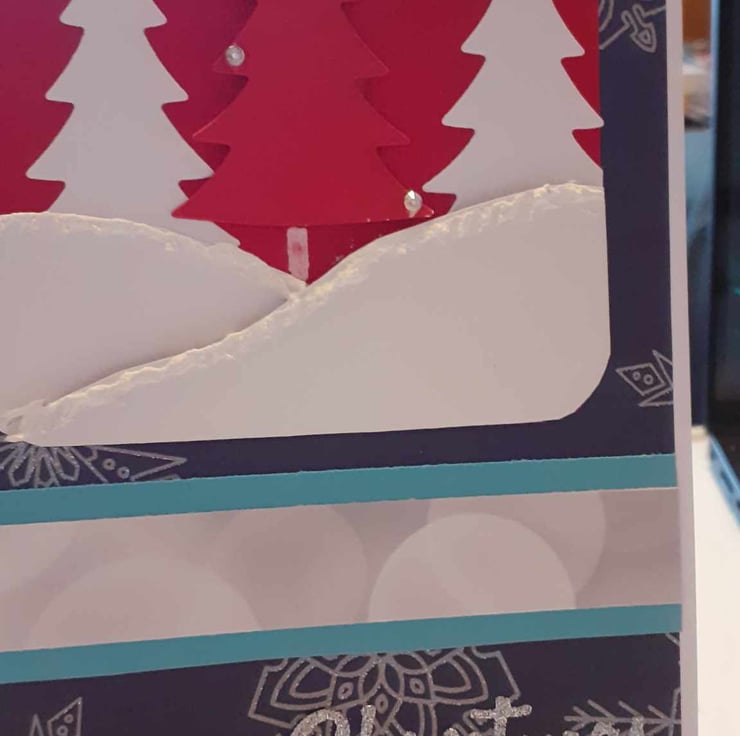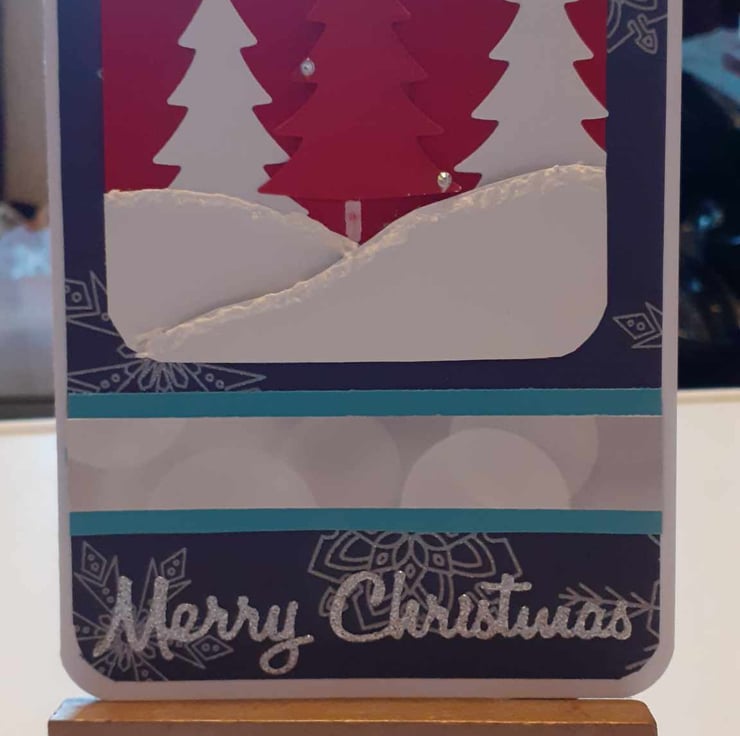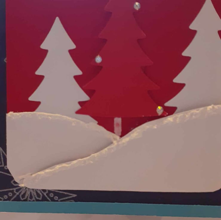 This is a unique one-off card to send to loved ones. The card has rounded corners to give it a vintage feel. The card has a red and blue background. The card has three white christmas trees on a mound of snow. The card has faux snow effect and diamante's finish the design.