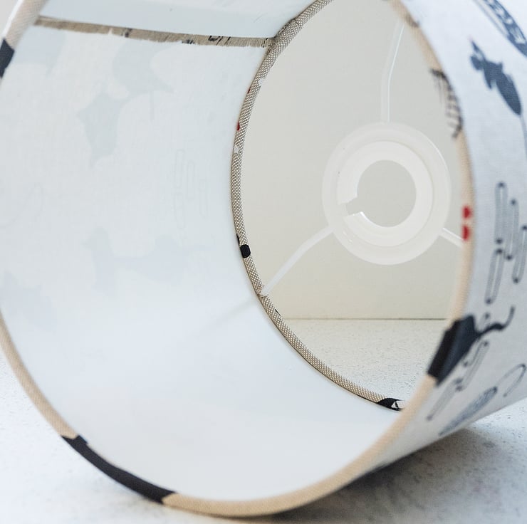 We recommend the use of low energy bulbs with our lampshades. They use less energy and are cool to the touch, avoiding the problem of scorching the shades. The inside of the lampshade is fire-retardant, anti-yellowing white PVC.