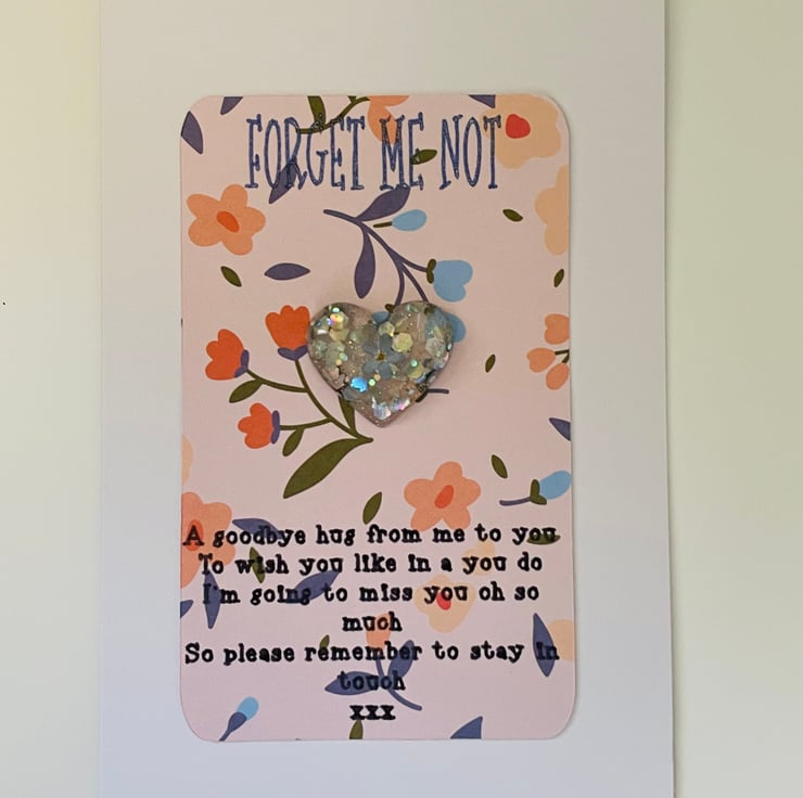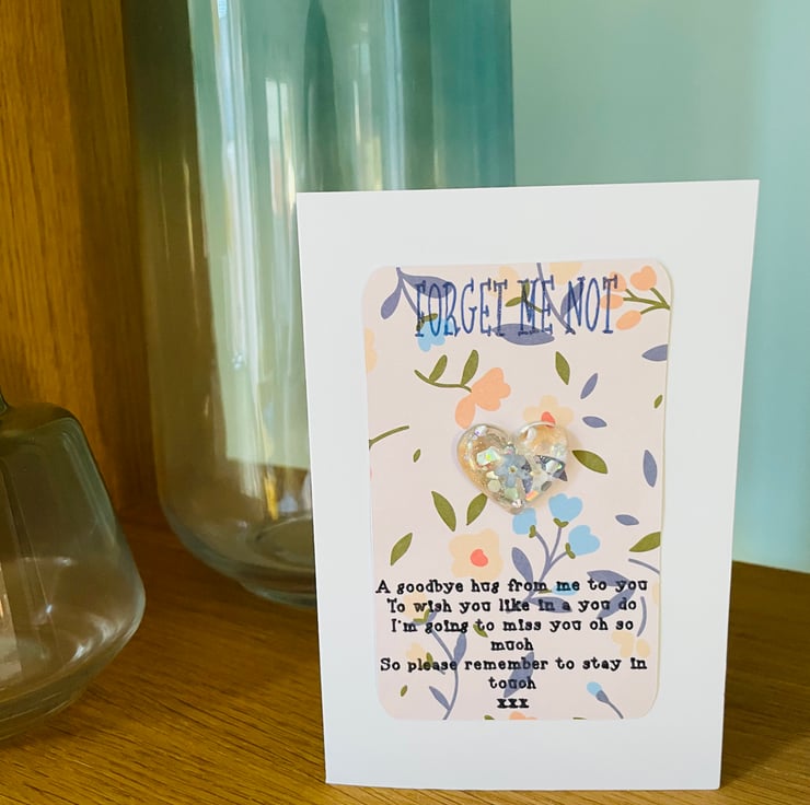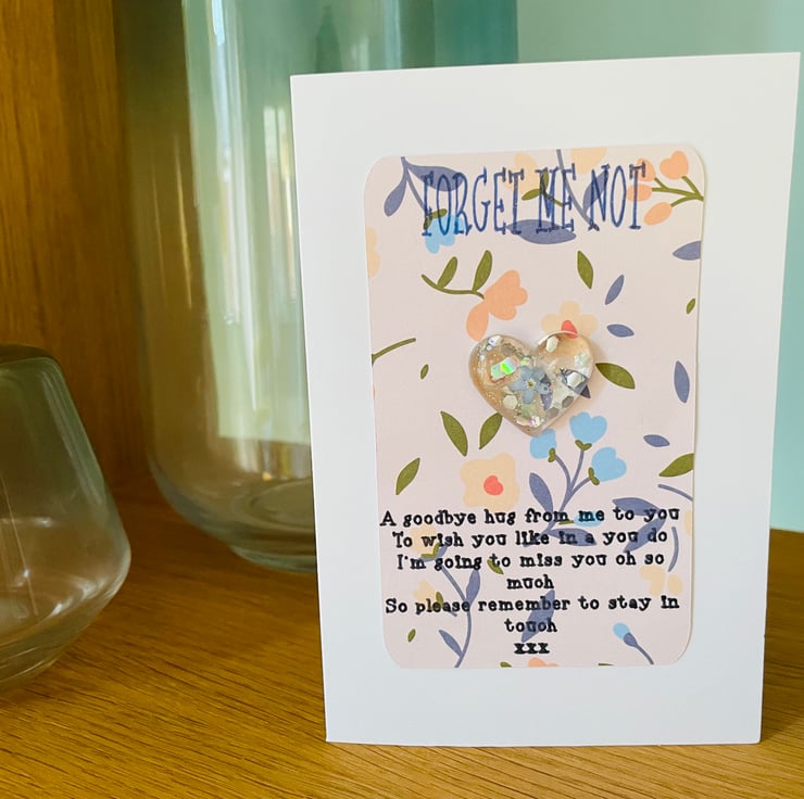 Forget me not pocket hug card, perfect for a friend or colleague leaving. A cute 6x4 card with a printed ‘forget me not’ poem and a resin heart keepsake with a real forget me not inside. The inside of the card is blank for your own message.