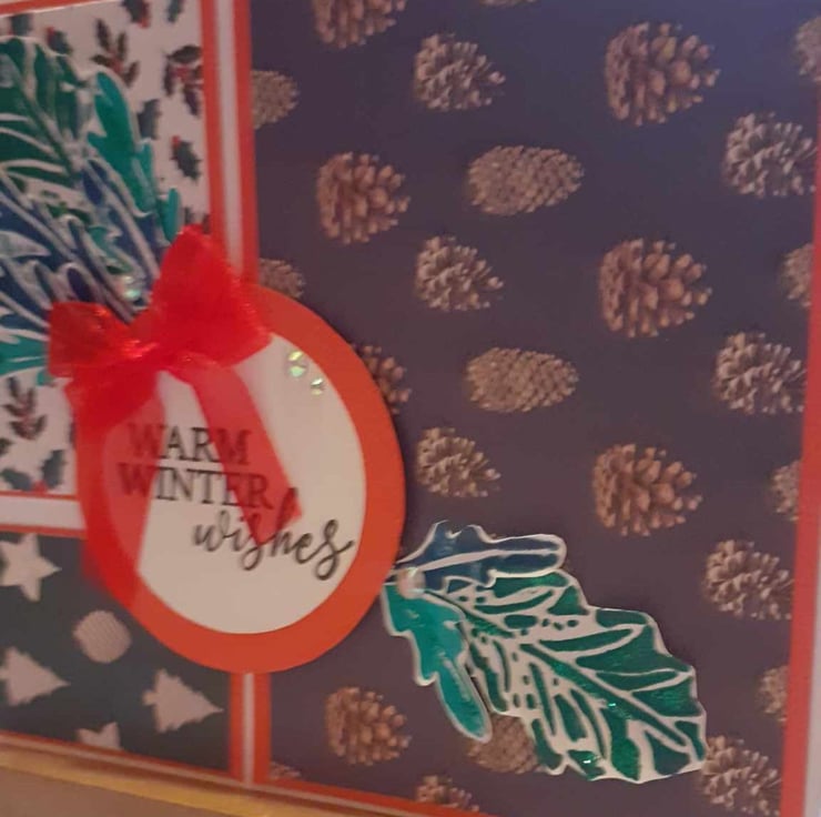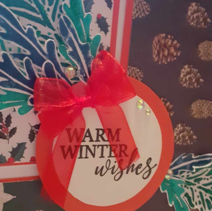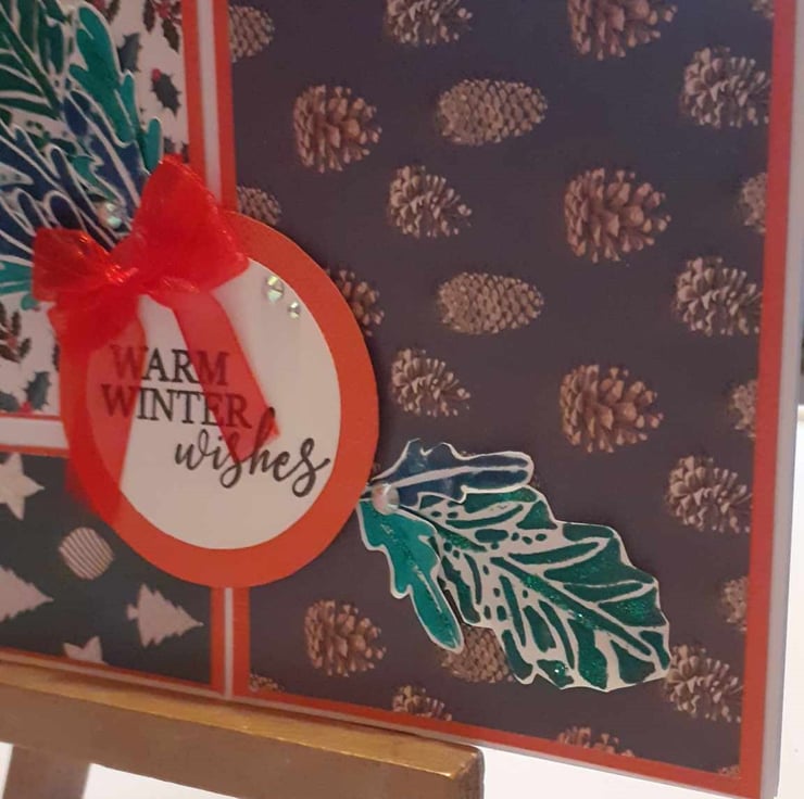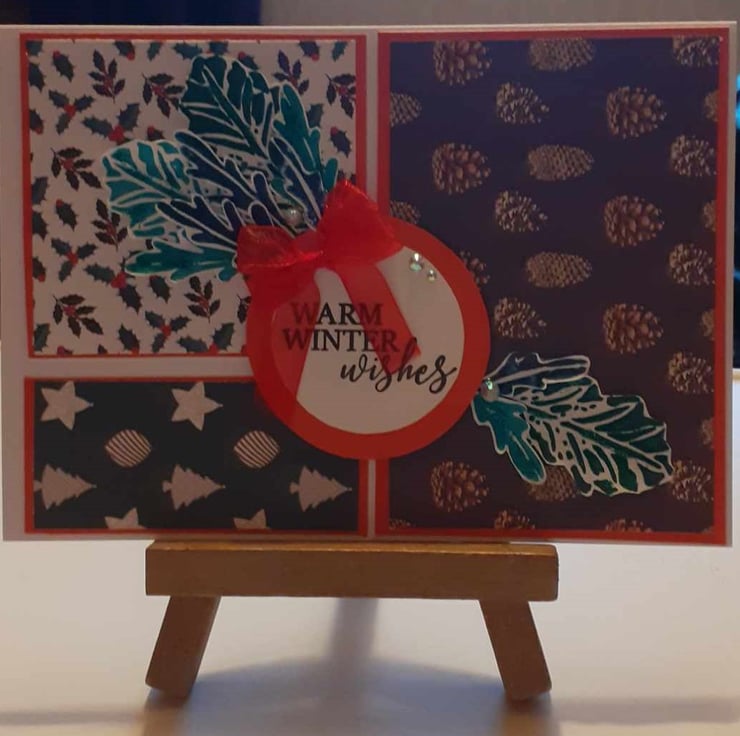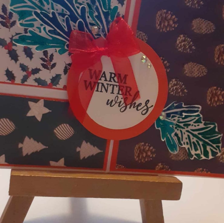 This is a unique one-off card to send to loved ones. The card is paneled with three different types of Christmas paper: blue acorns, green christmas trees and holly. The card has two stitched circles one in a coral pink and the other is white with "Warm Winter Wishes" on the sentiment. The card has coral pink borders, red bow, green holly and diamante's to complete the design.