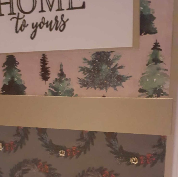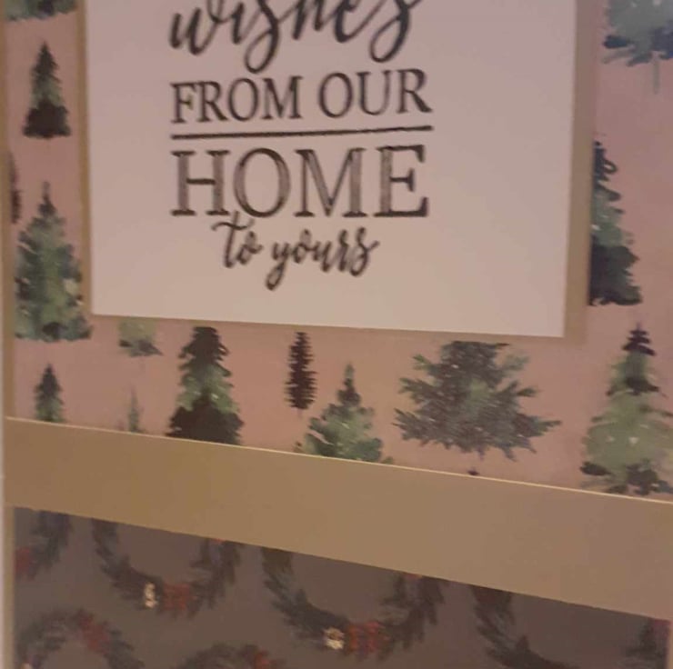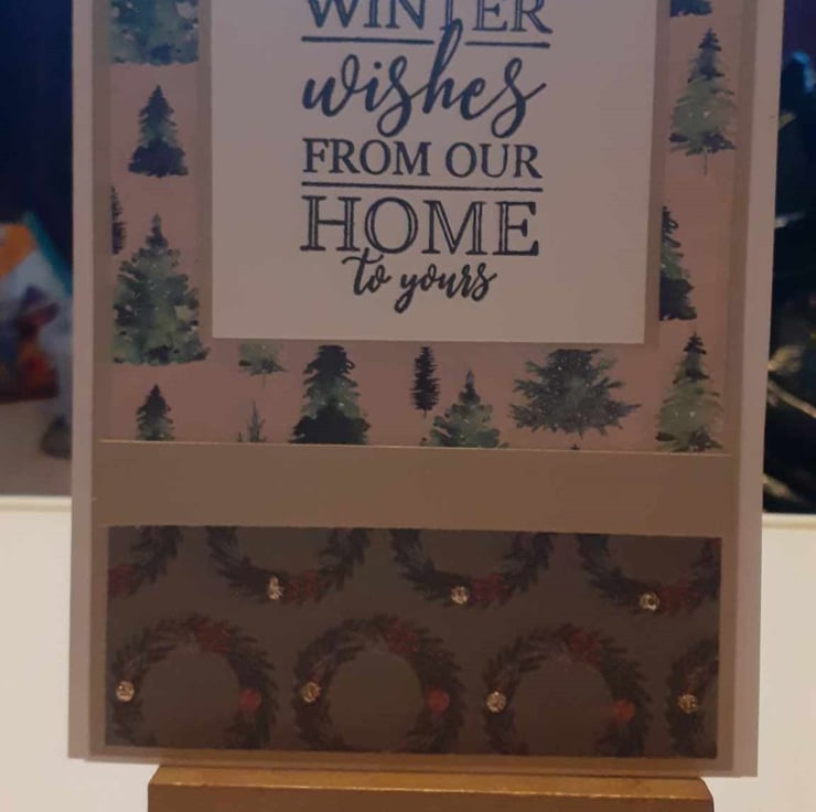 This is a unique one-off card to send to loved ones. The card has a paneled background with green trees and green wreaths. The card has a white sentiment and diamante's finish the design.