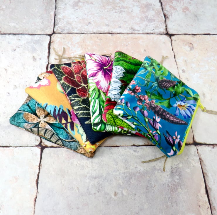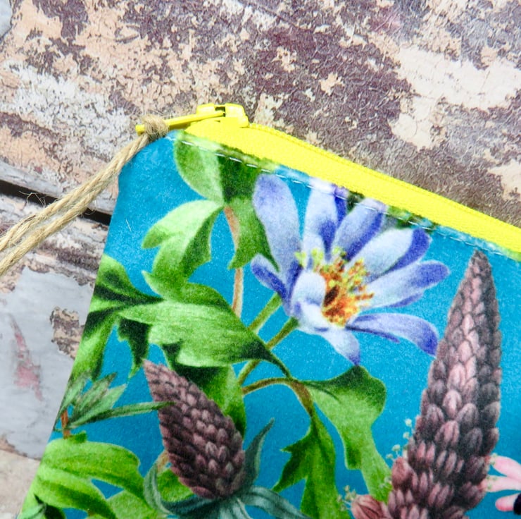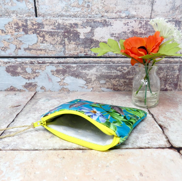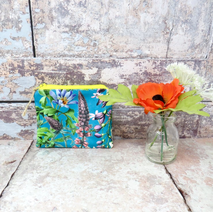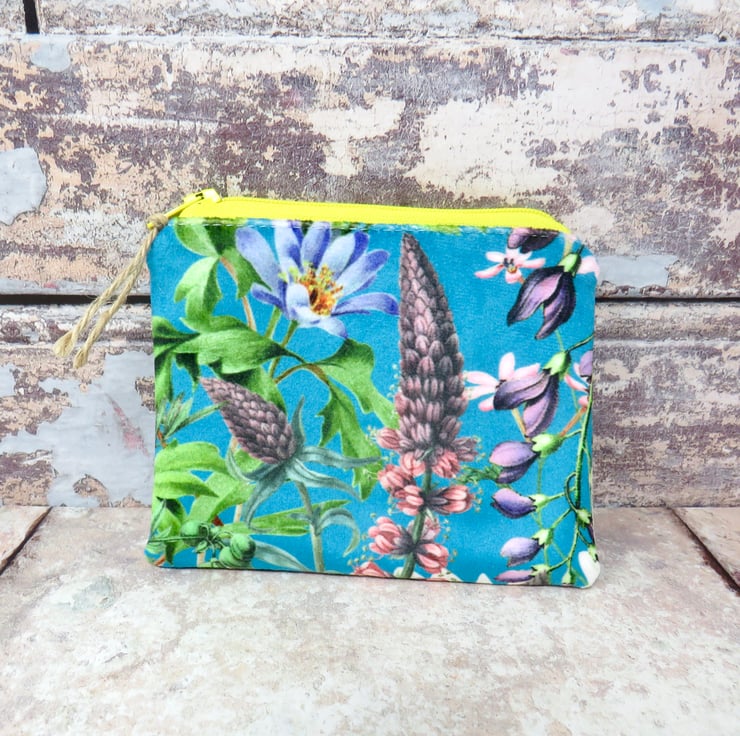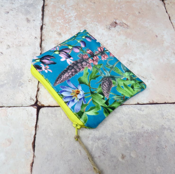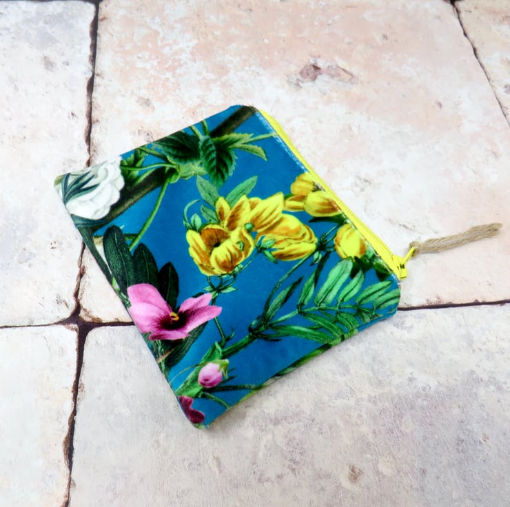 A pretty and useful coin purse, handmade in a gorgeously soft velvet fabric featuring flowers on a turquoise background. The purse is lined in a grey cotton print and closes with a yellow zip. It measures 12 cm wide x 10 cm high and will hold your cash, cards and keys with ease. Makes a great gift or stocking filler.