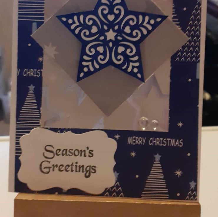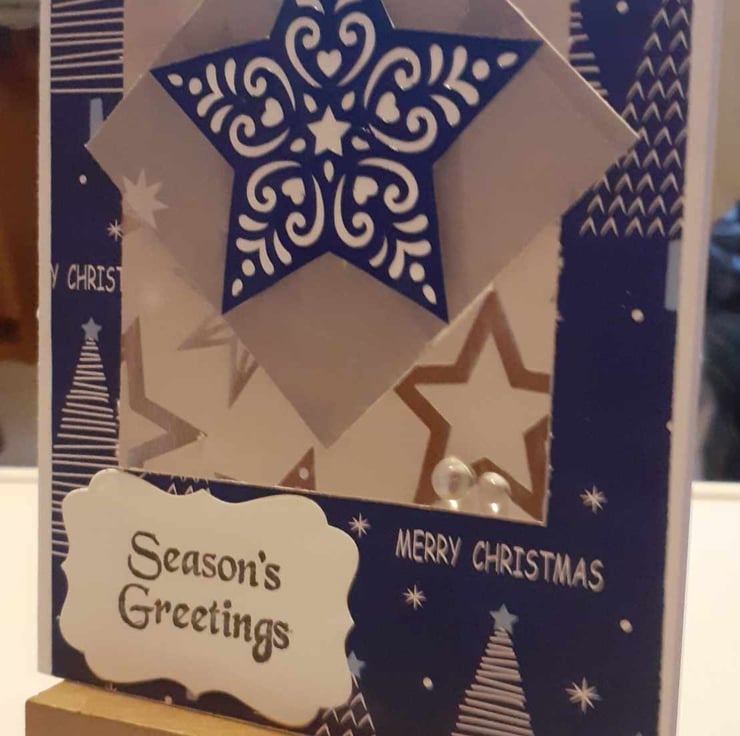 This is a unique one-off card to send to loved ones. The card is a blue christmas background. The card card has a grey paneled paper and grey holly paper, the paper is layered panel. The card has white vintage sentiment "Seasons Greetings". The card has a blue and white embellishments and diamante's finish the design.