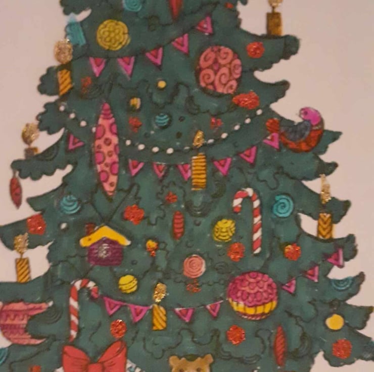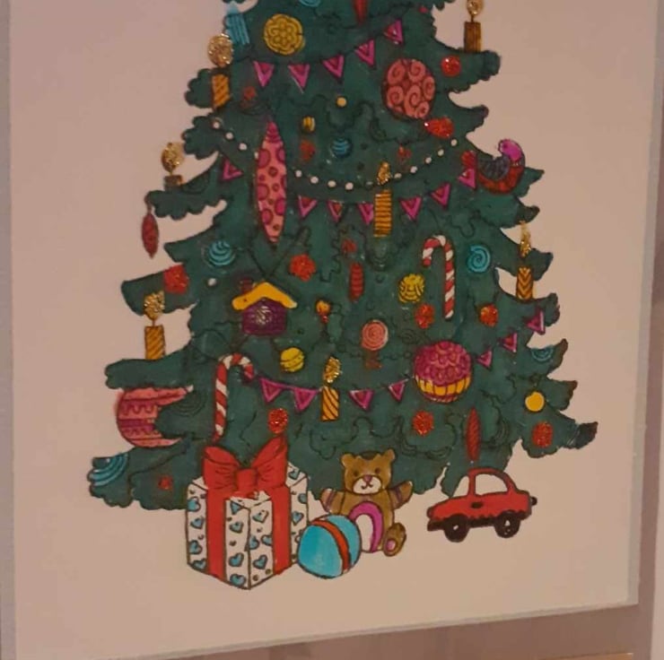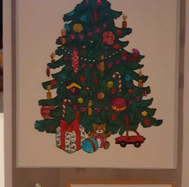 This is a unique one-off card to send to loved ones. The card has a vintage feel with a christmas tree design. The card has a plain background. The card has diamante's finish the design.
