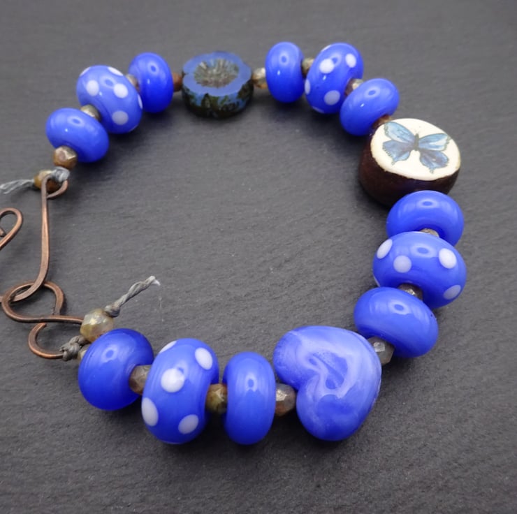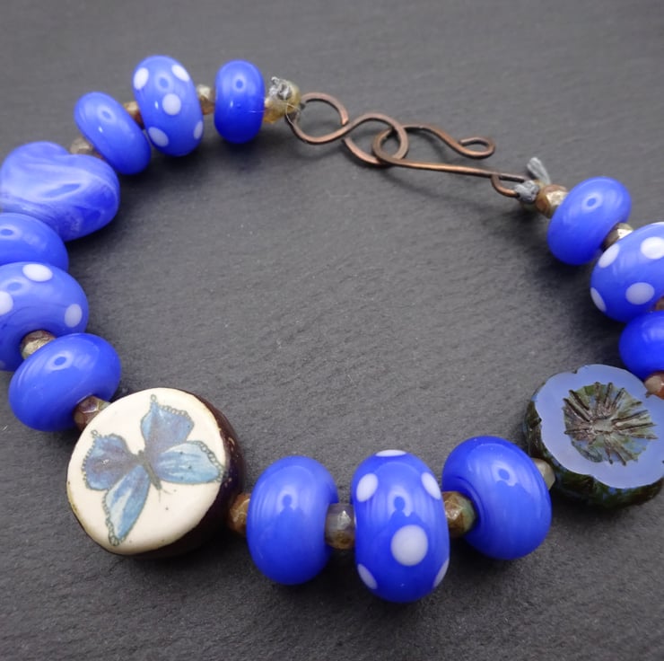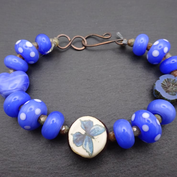 A bracelet made with handmade lampwork glass beads, Czech glass beads and a handmade ceramic butterfly bead.