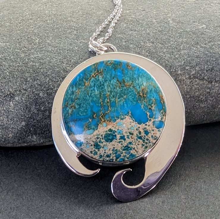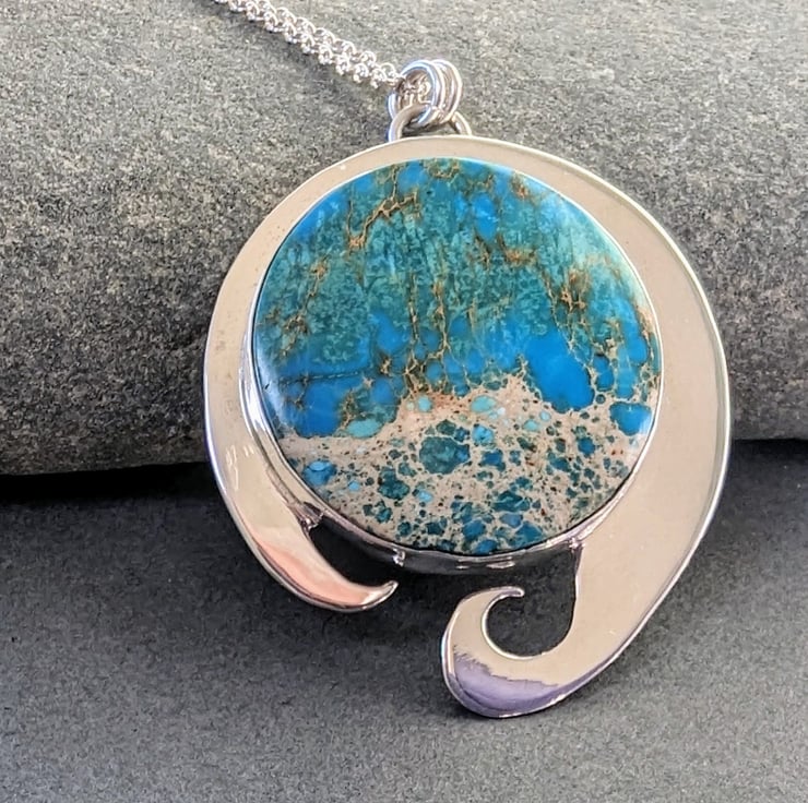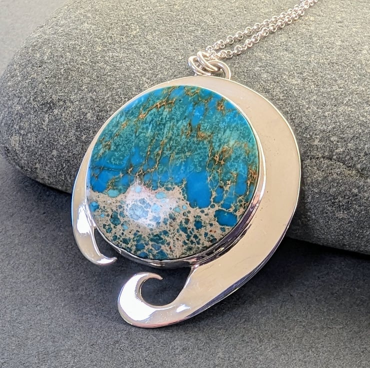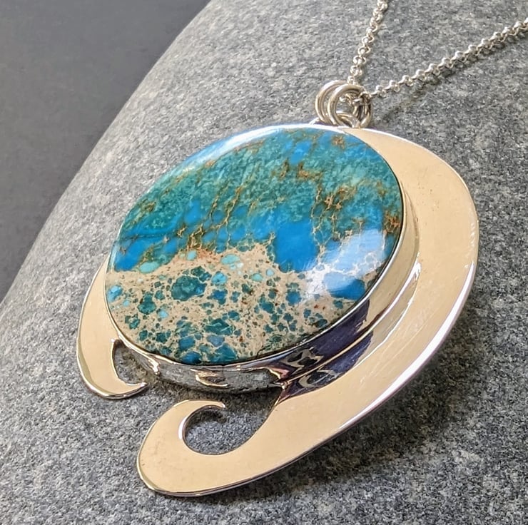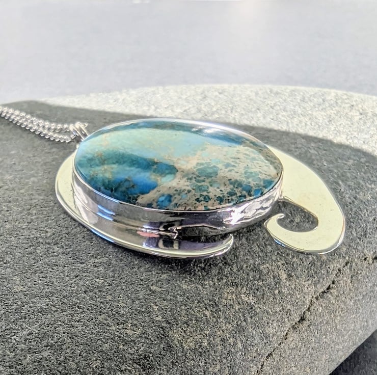 A fabulous pendant comprising of a beautiful smooth, blue-green gemstone set on a larger beautifully shaped sterling silver backplate Overall measurement approximately 1.5" wide by 1.75" at widest parts. The pendant is suspended from a sterling silver 18" chain. All my pieces are hallmarked at Edinburgh Assay Office.