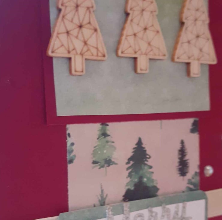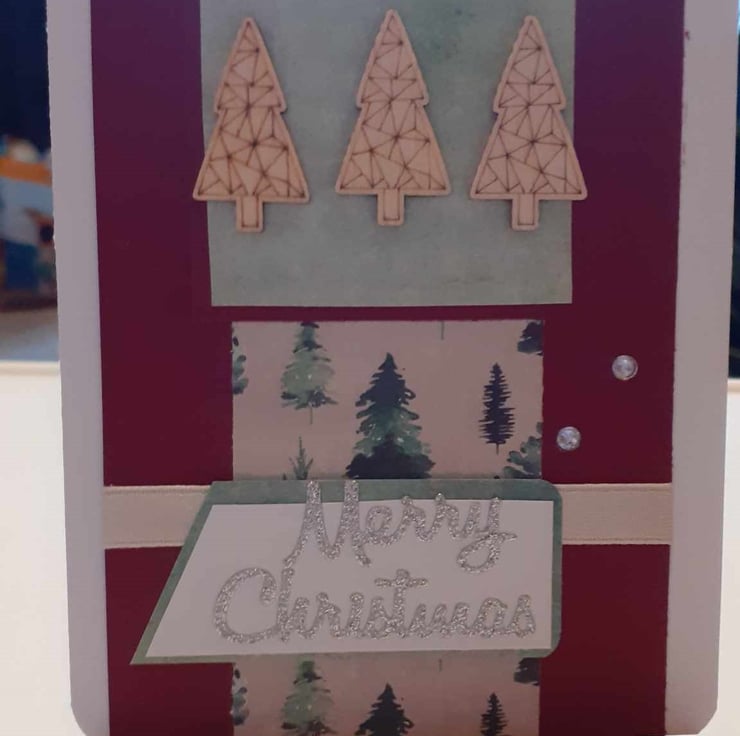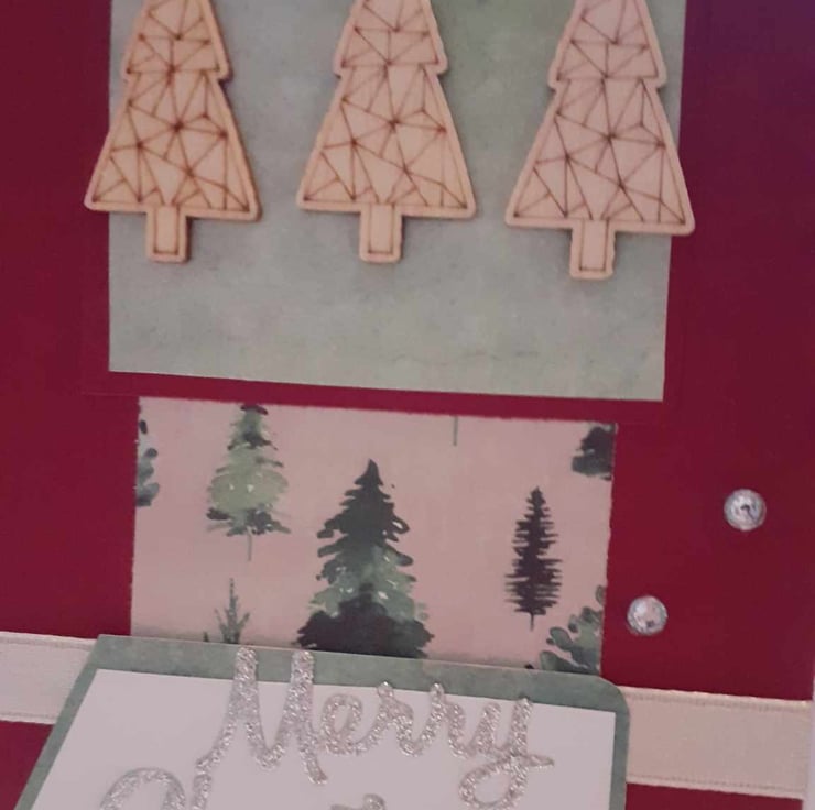 This is a unique one-off card to send to loved ones. The card has a vintage feel. The card has a red background with a green embossed panel and a christmas tree panel. The card has three wooden trees with a ribbon border. The card has diamante's finish the design.