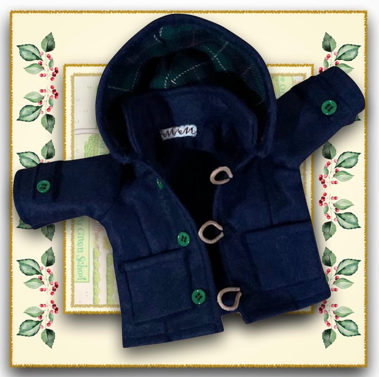 A beautiful little navy blue duffle coat with a tartan lined hood to fit the Mulberry Green dolls. The coat has a hood, little pockets, sleeve tabs decorated with buttons and leather loop button fastenings.