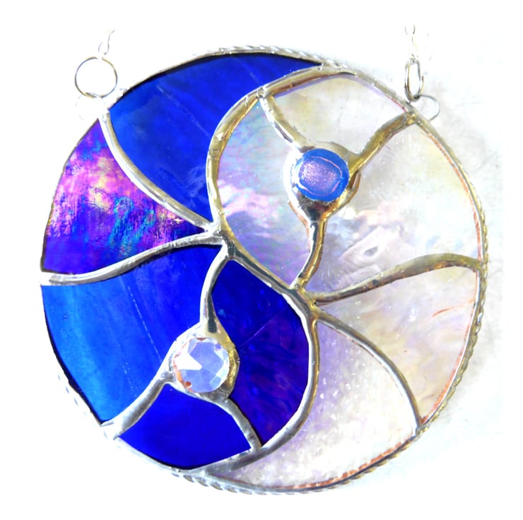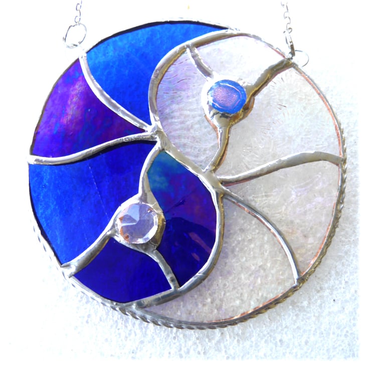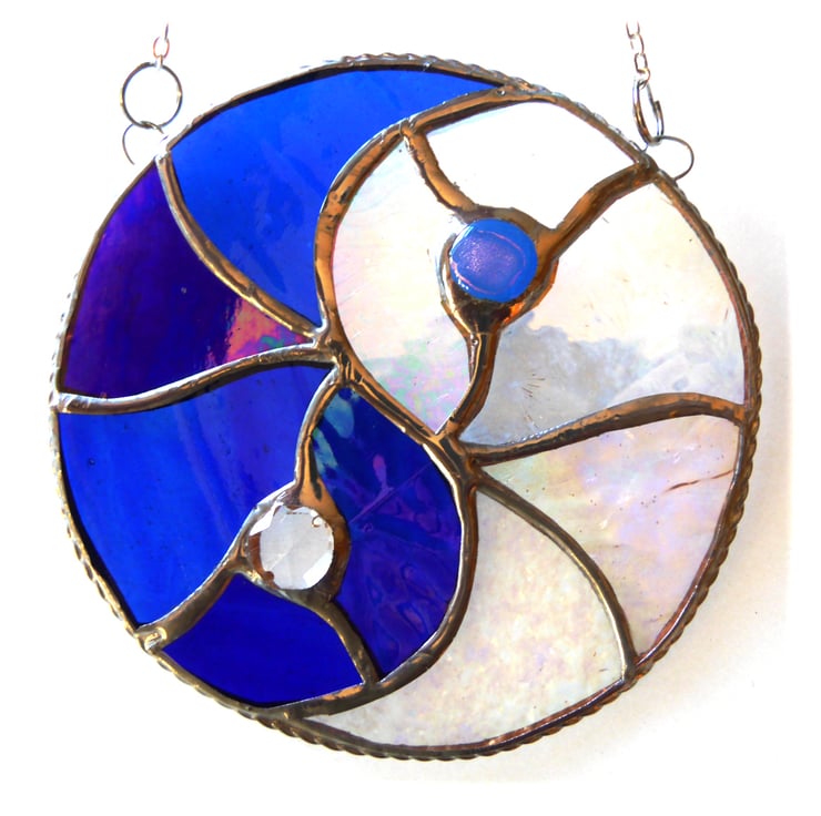 One half is made from 5 types of bright blue glass and the other from 5 types of clear iridescent glass. Although the beauty of this symbol is in its simplicity I've used artistic licence and added movement with different textures and shades.