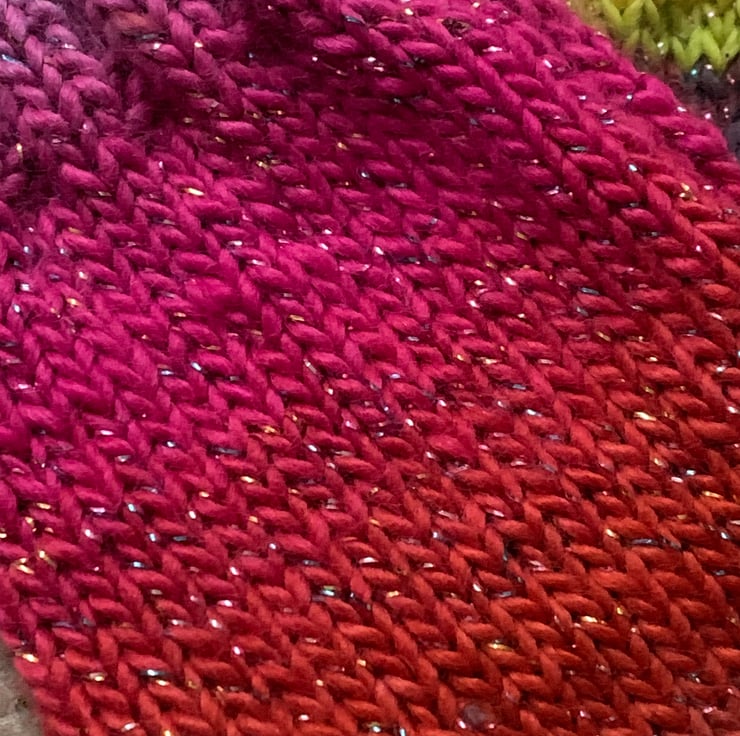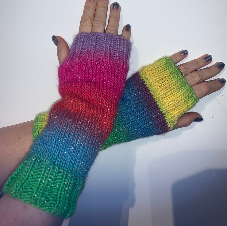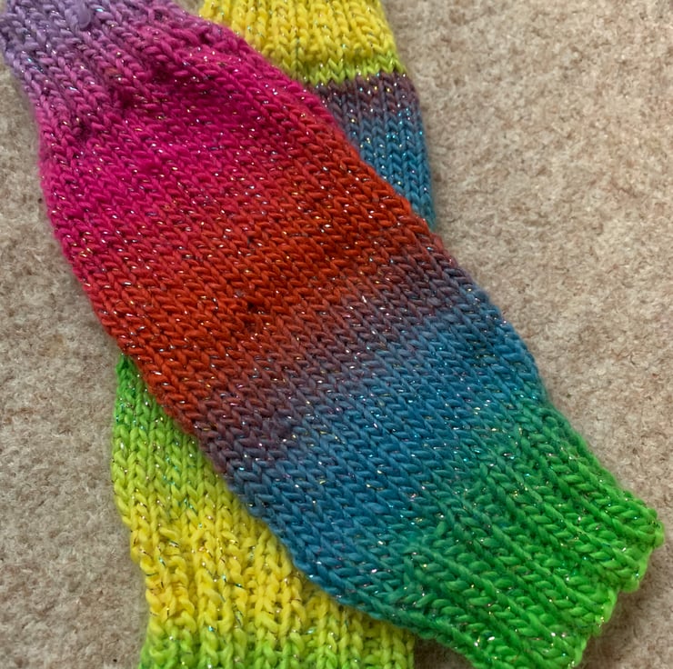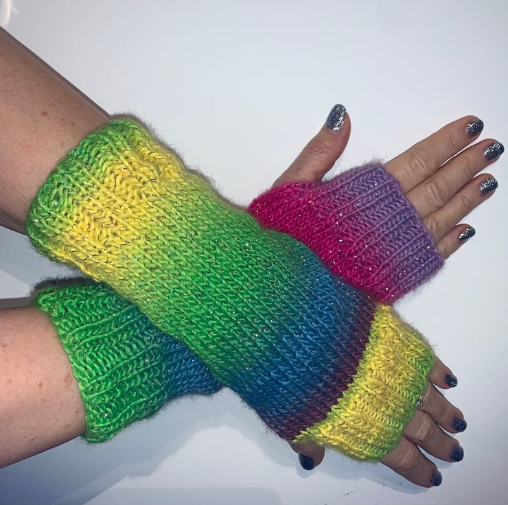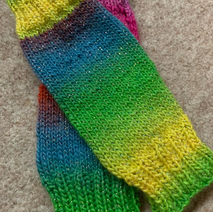A vibrant, bright and colourful pair of fingerless wrist warmers. They are both different colours due to how the yarn flowed and have a metallic thread running through them to give them extra sparkle. They are lightweight but warm and will fit an average sized ladies hand. Would make a nice bright and unique addition to a chilly day.