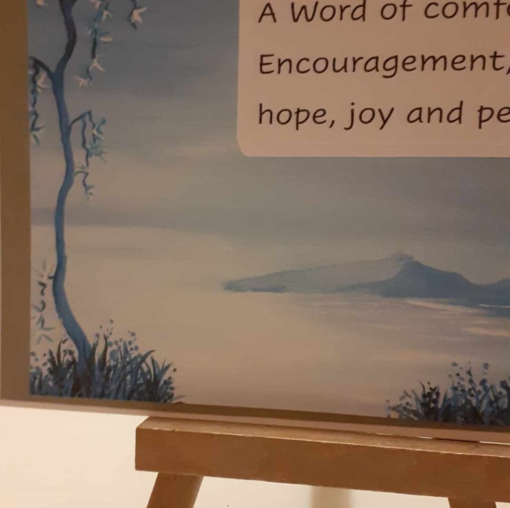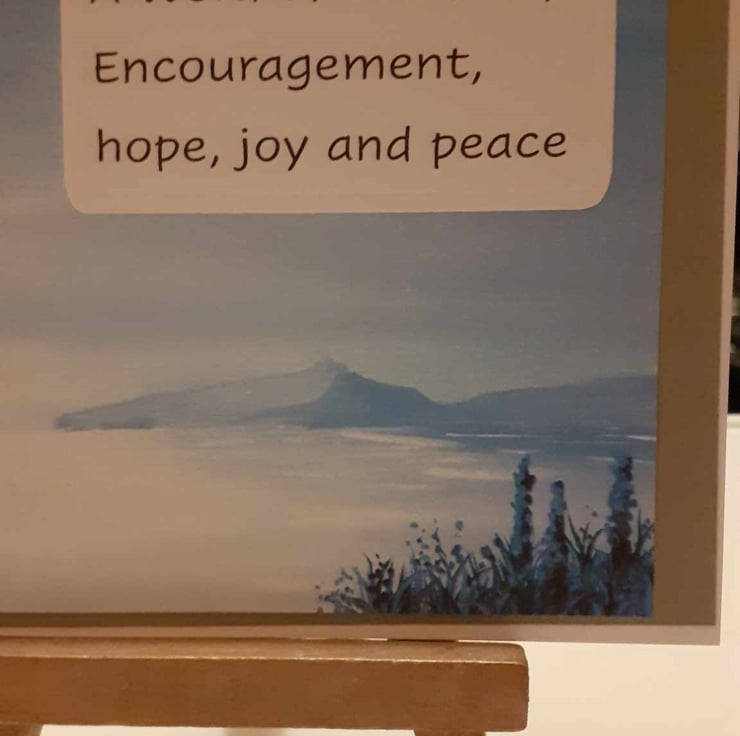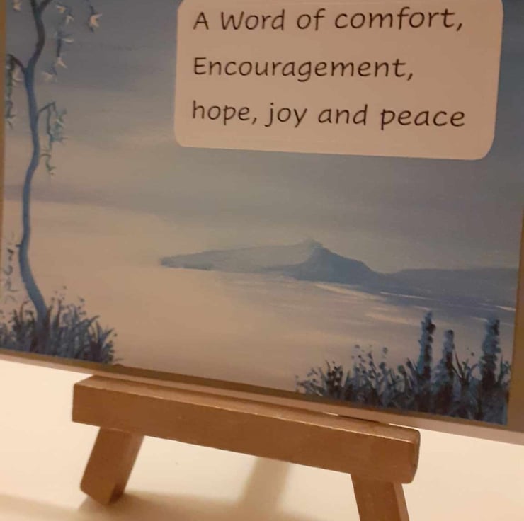 This is a unique design. A friend painted this image and allowed me to use it for making cards. It is a truly one-off design. The image has a grey border with "A word of comfort, encouragement, hope, joy and peace.