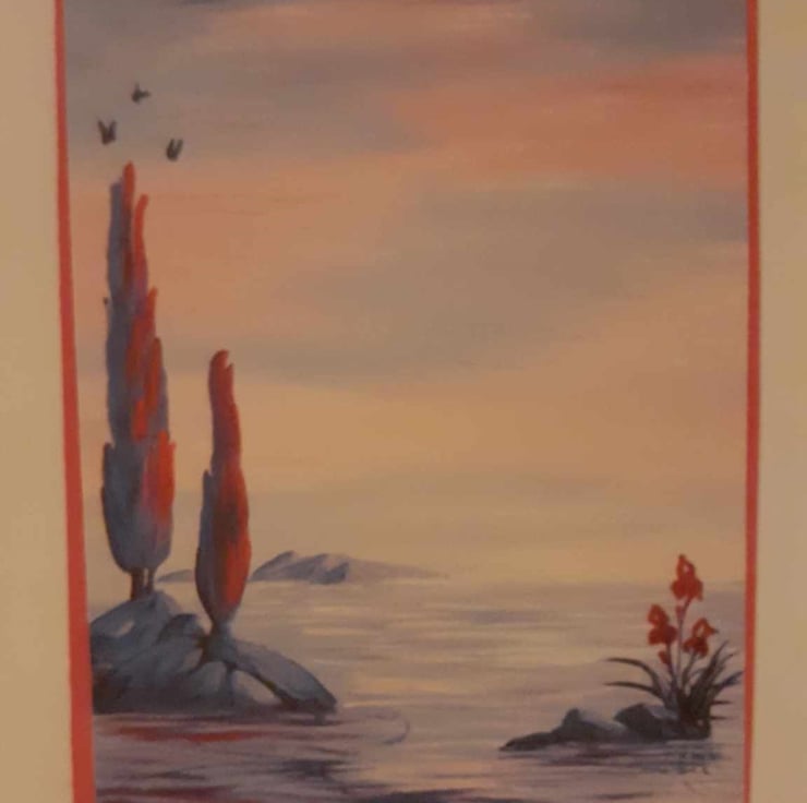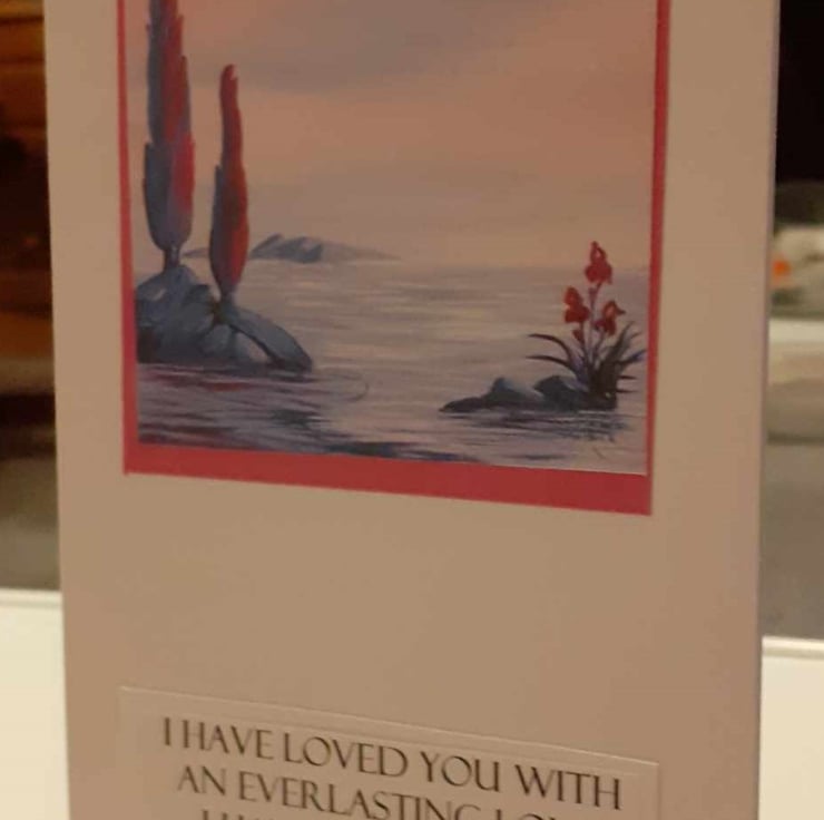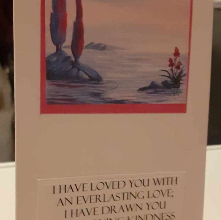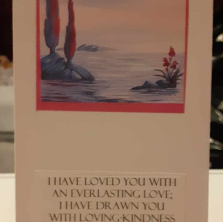 This is a unique one-off style of card. My friend is an artist and has created artwork for curly craft cards. The image has a pink border and a sentiment reading " I have loved you with an everlasting love; I have drawn you with loving-kindness" Jeremiah 31:3.