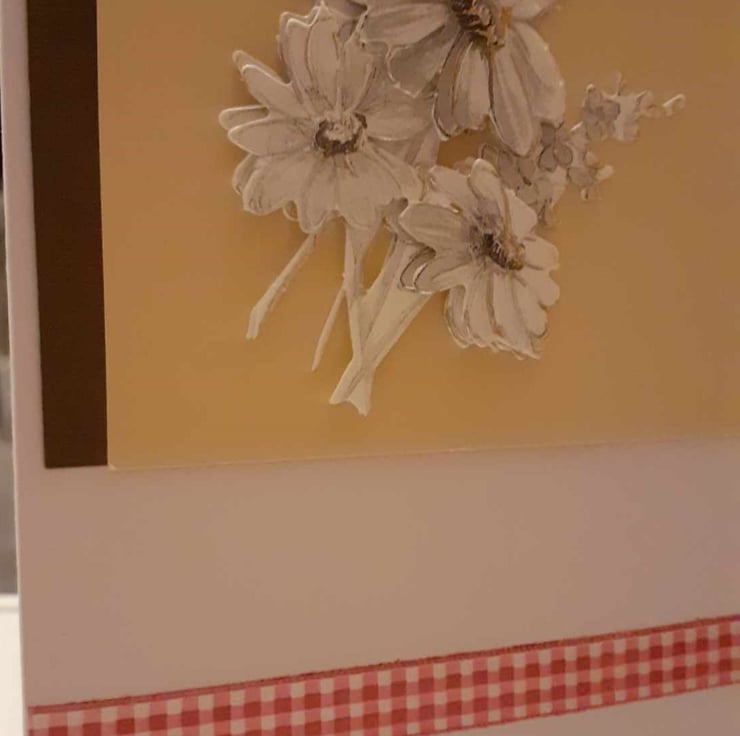 This is a unique and one off card. The card has a yellow and brown panel with 3D flower embellishment. The card has a pink gingham ribbon border with a sentiment that reads, "Even when it seems like your world is crumbling, God has a plan. He's working out behind the scenes".