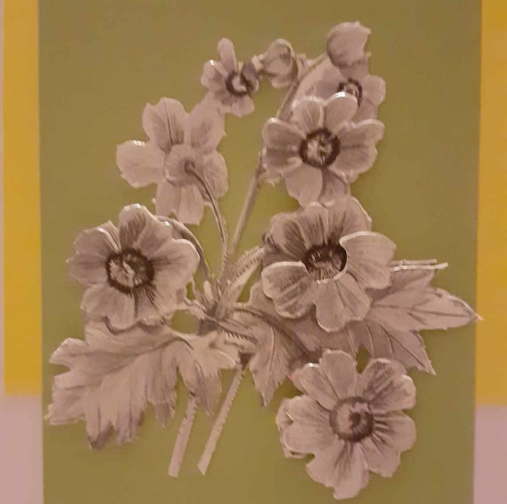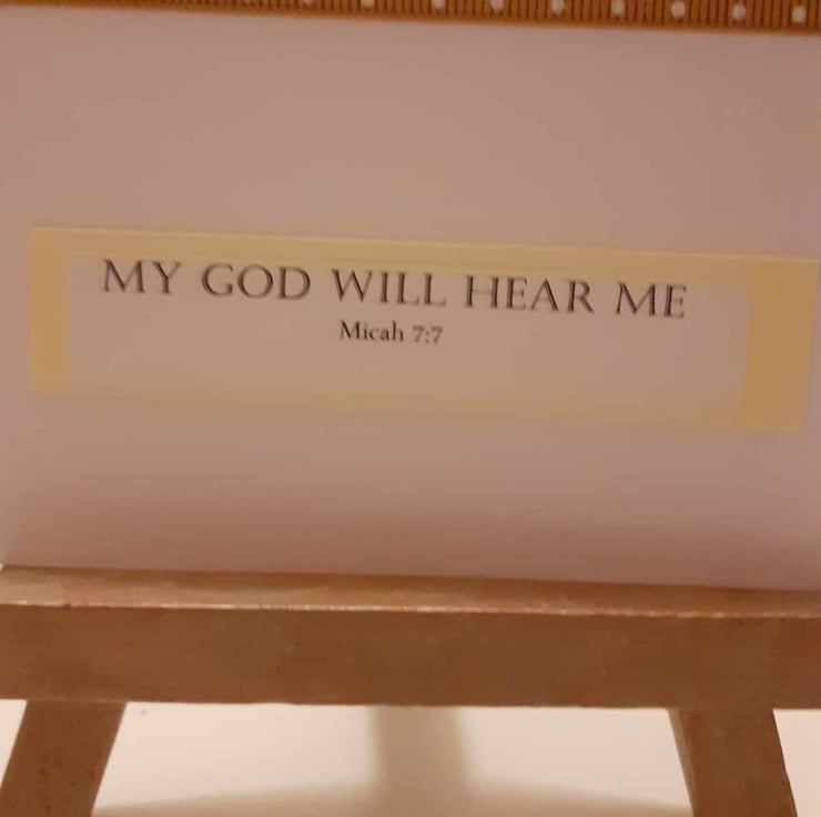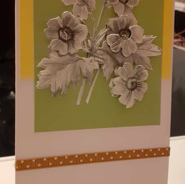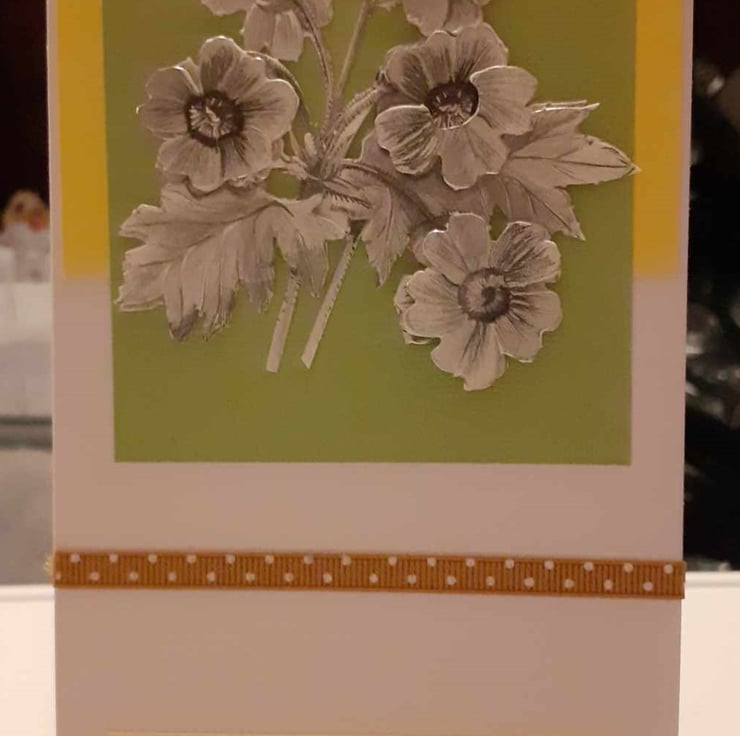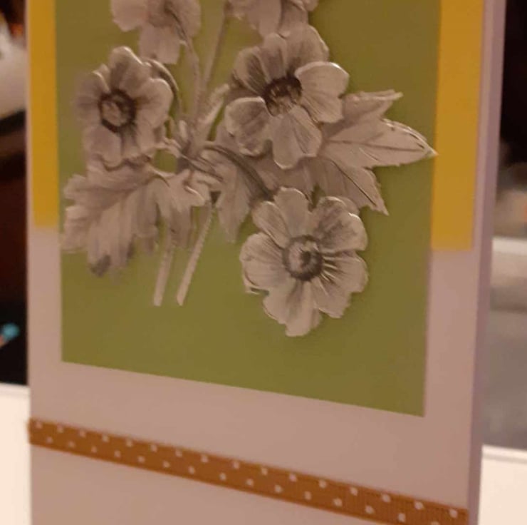 This is a unique one-ff design. The card has a yellow shimmer and green panels with a silver 2D flower design. The card has a brown and white polka dot ribbon border with the sentiment "My God will hear me" Micah 7:7.