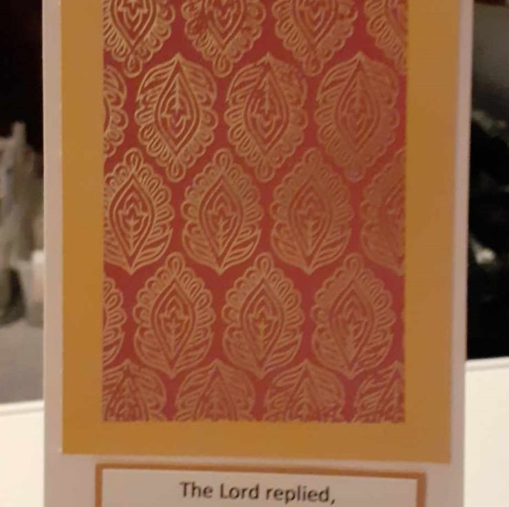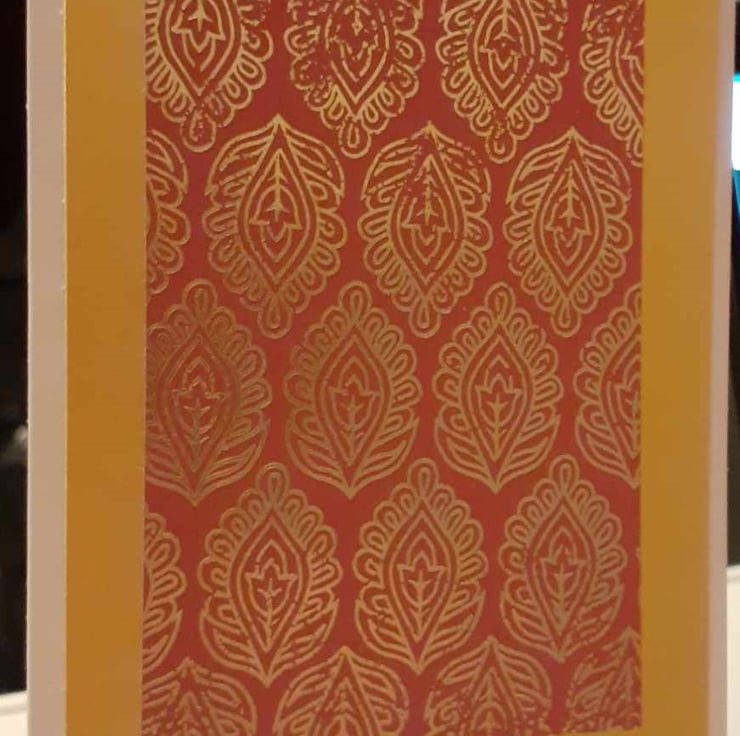 This is a unique one-off card. The card has a pink and gold paisley pattern paper with a gold border. The sentiment reads "