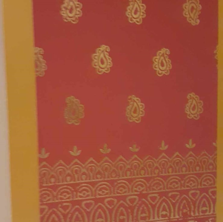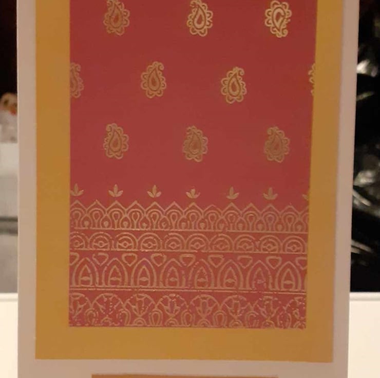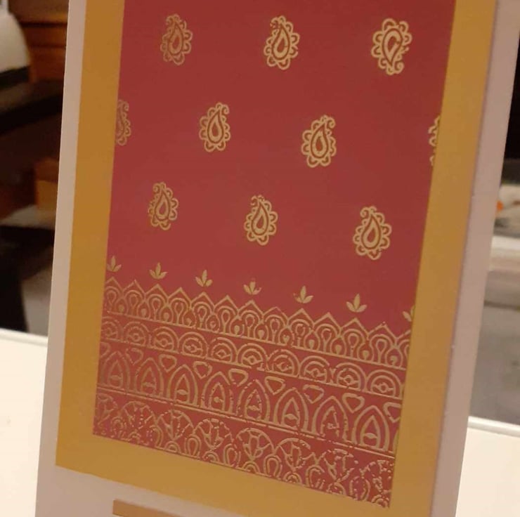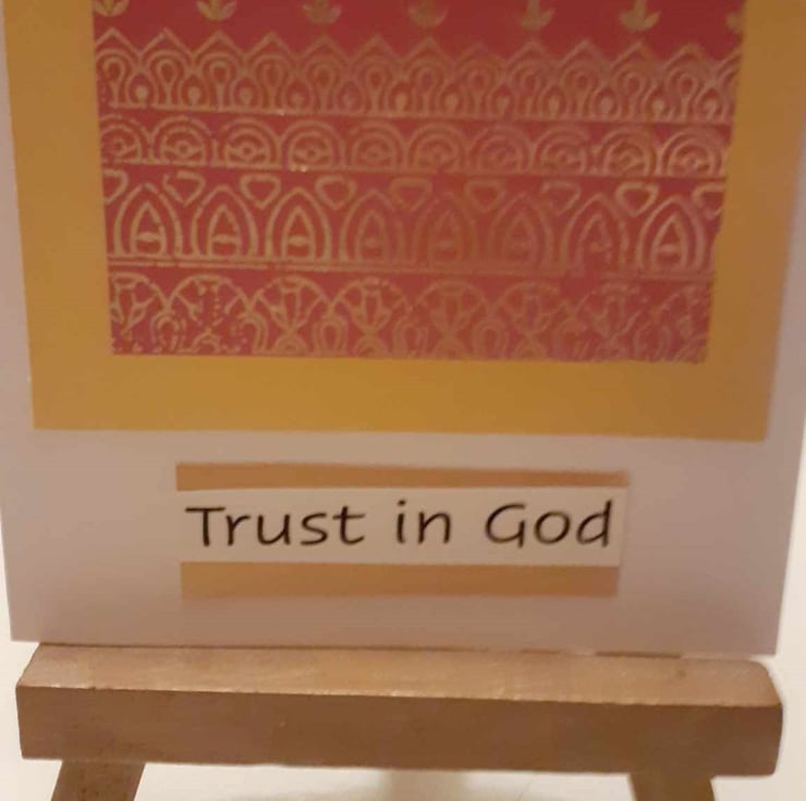 This is a unique one-off card. The card has a pink and gold paisley pattern paper with a gold border. The sentiment reads "Trust in God".