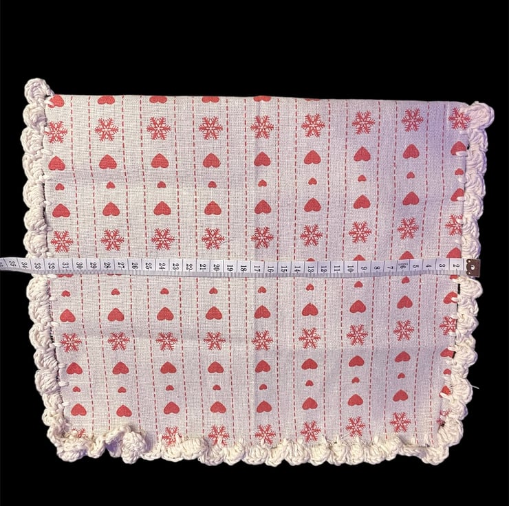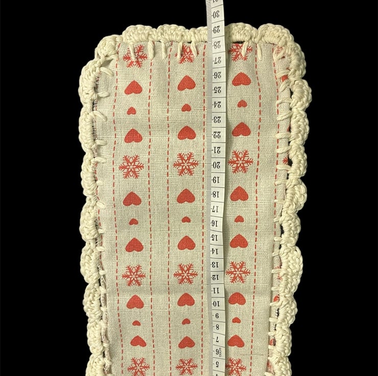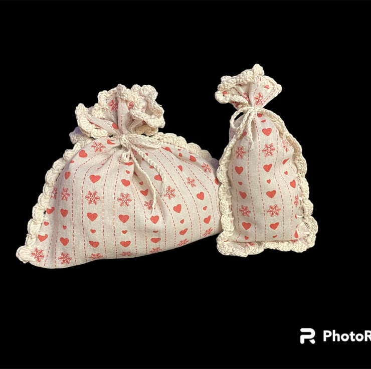 This set of 2 Christmas Gift Bags are handmade with a crochet scallop edge to give them the Rustic Christmas vibe. They are made from cotton weave fabric, with a crocheted scallop shell trim over the rough edges and includes a simple crochet string to tie the bag close.