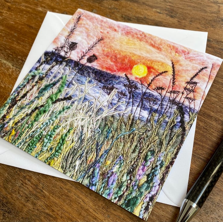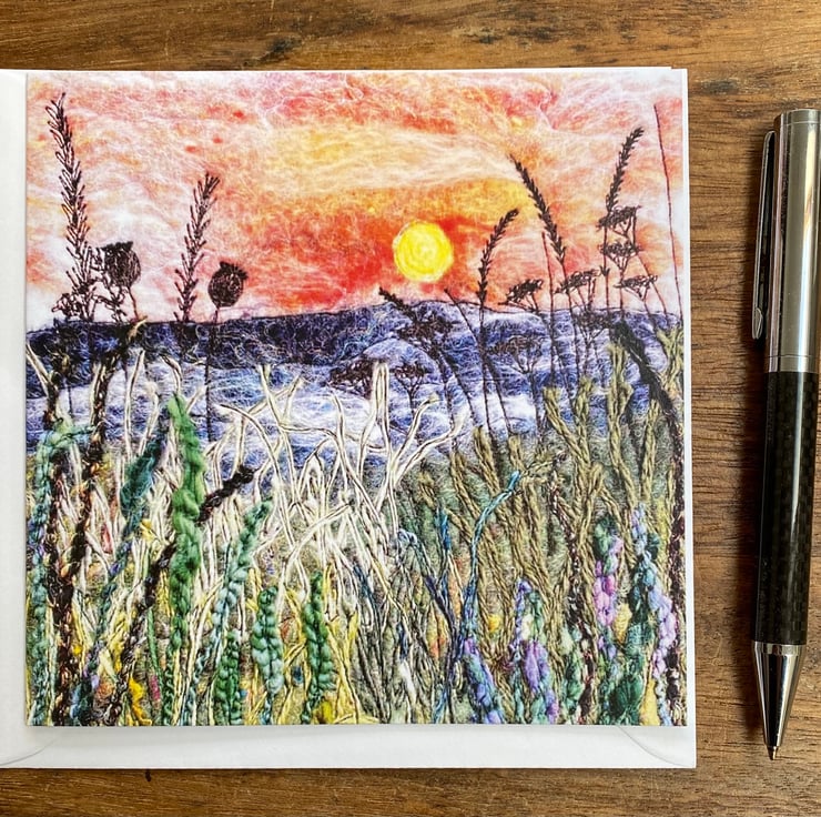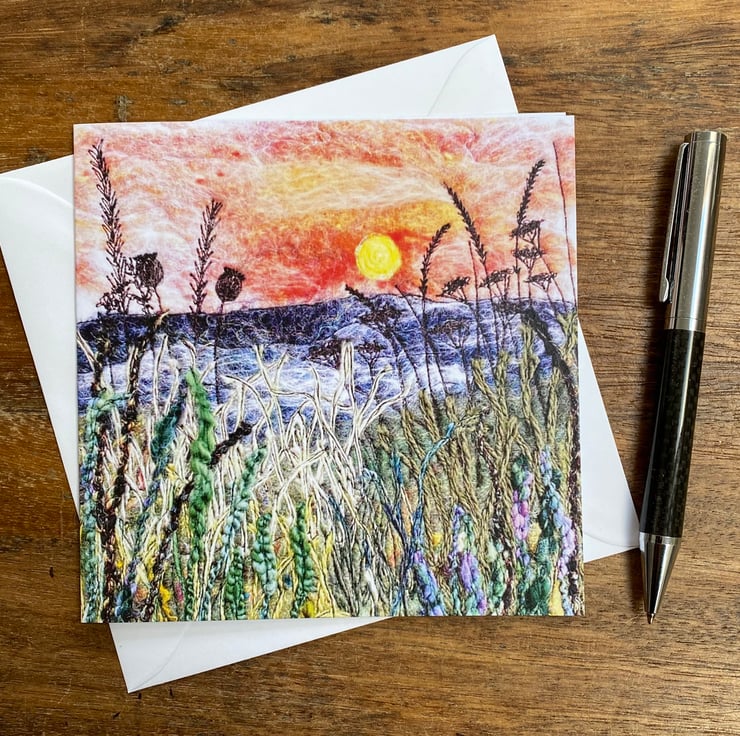 This card is a print of one of my free motion embroidered artworks. It shows a beautiful sunset scene over Wrose looking through a hedgerow. It’s blank inside making it ideal for any occasion. The card measures 14.5 x 14.5cm and it comes with an envelop in a plastic cover for protection.