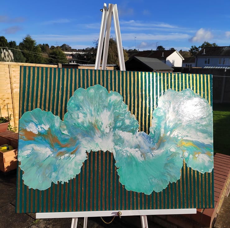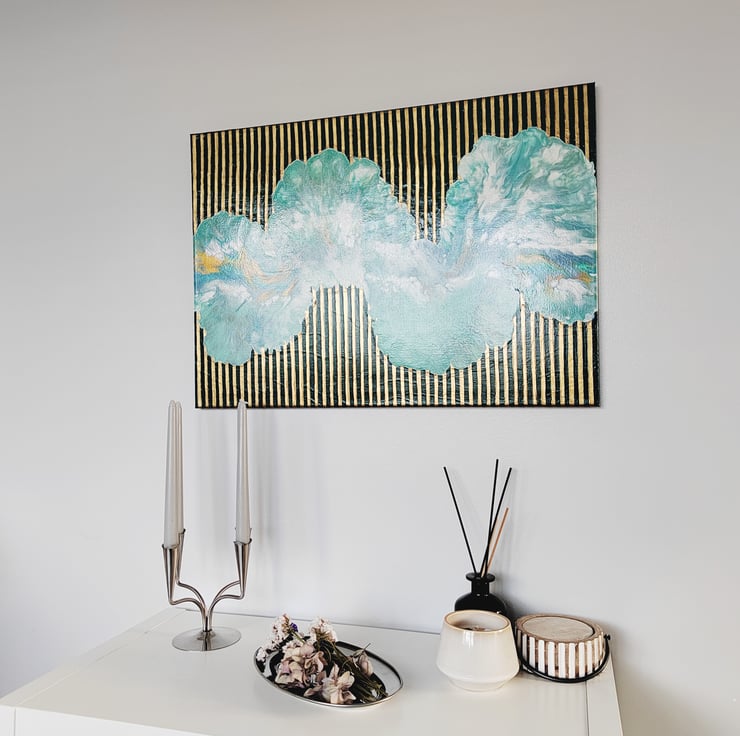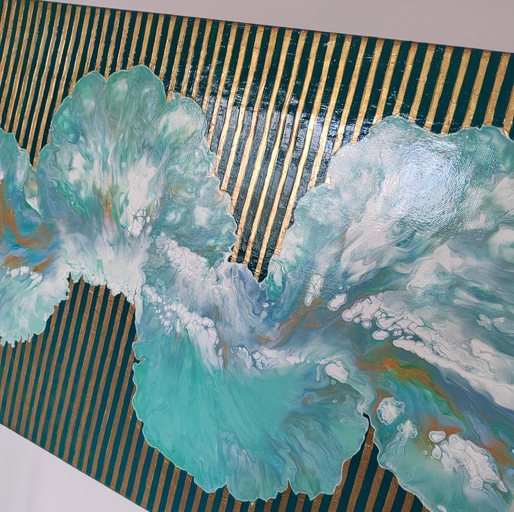 Original 50 x 70cm Abstract Caribbean Sea Wave Acrylic Painting that was Hand Poured and embellished with Gold Leaf - Wall Art, Perfect for Home or Office Decor.