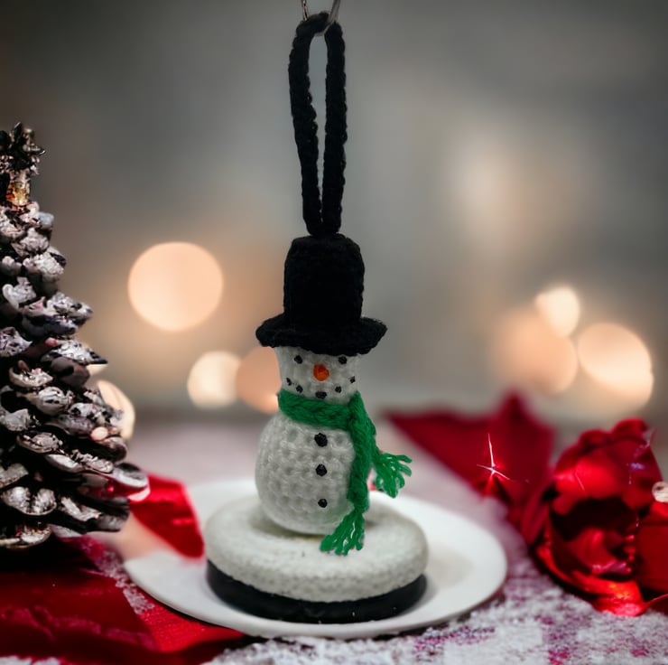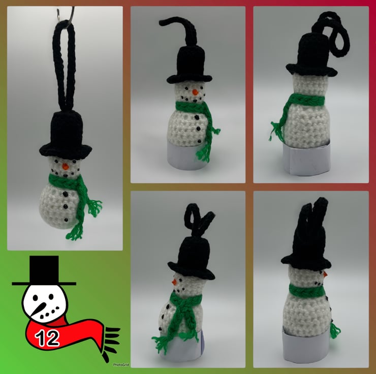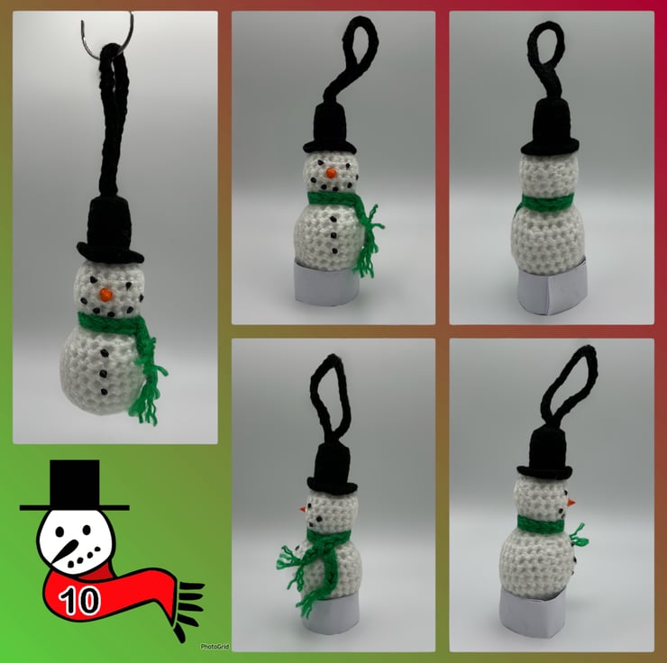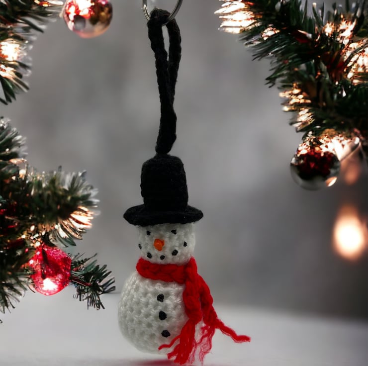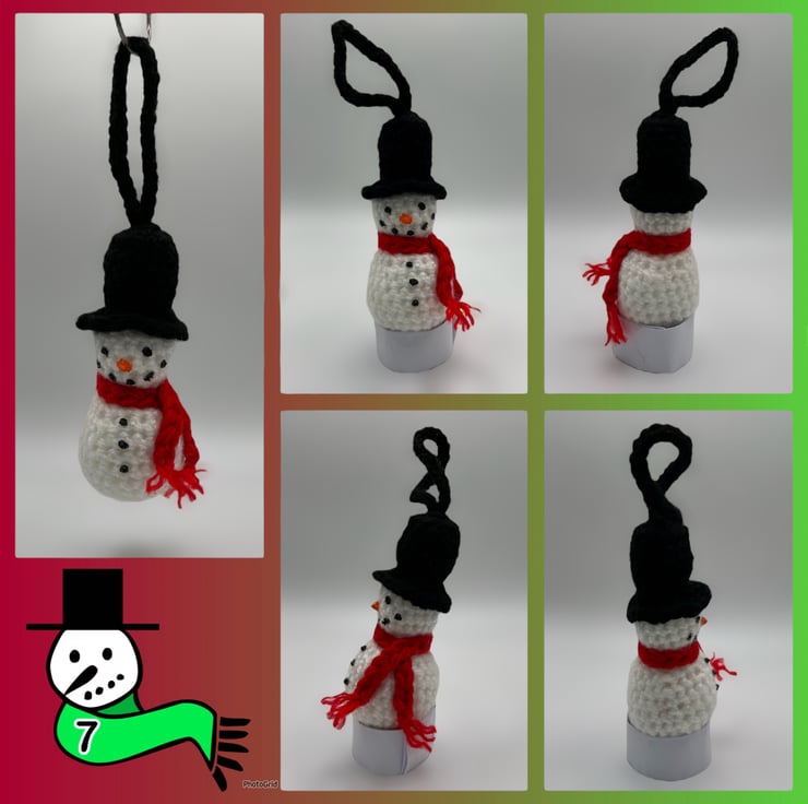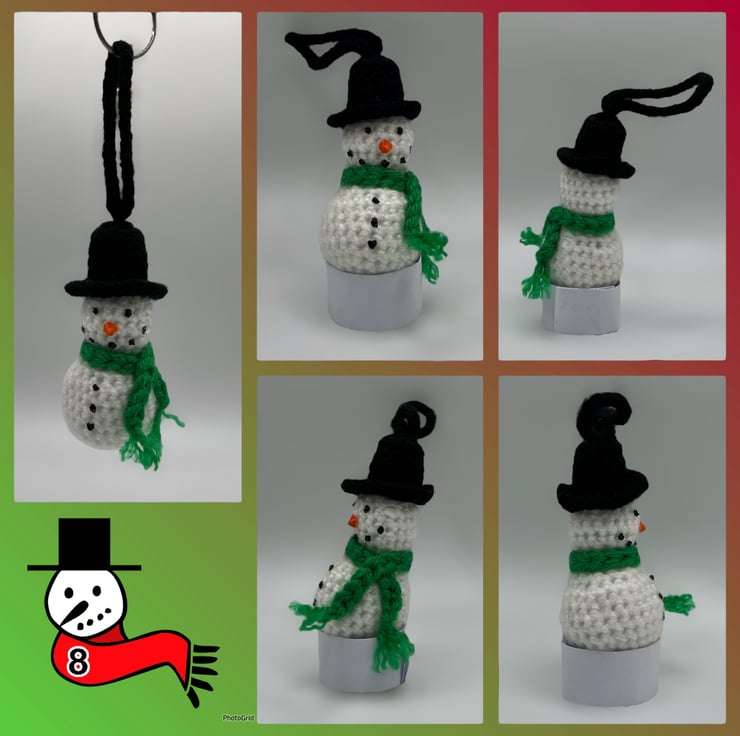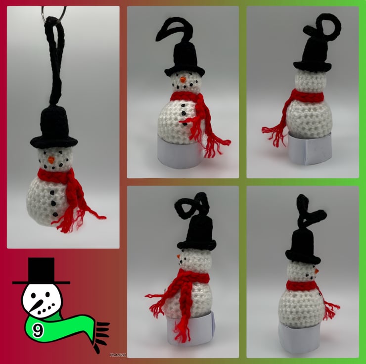 A lovely snowman to decorate your tree. Each snowman is made of a double crocheted ball filled with polyester filling. They have a crocheted scarf and top hat and puffy fabric paint embellishments. As these are handmade each snowman has its own unique look. Choose the one you like from the choice selection.