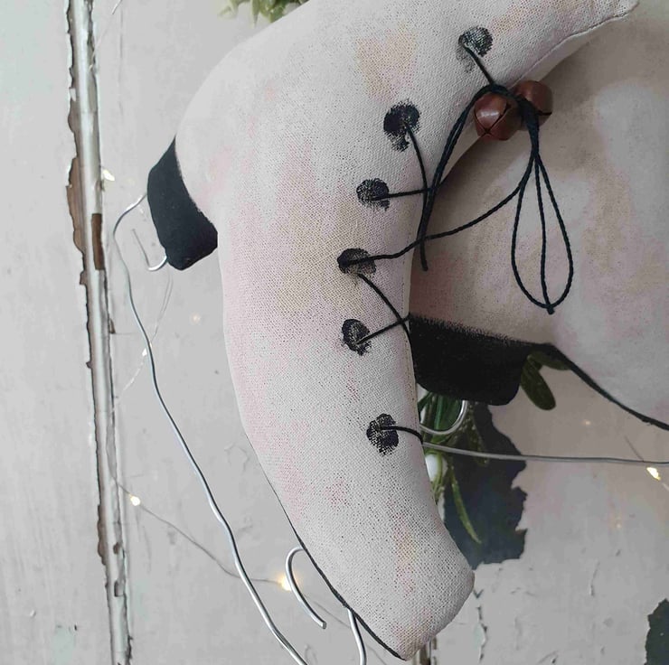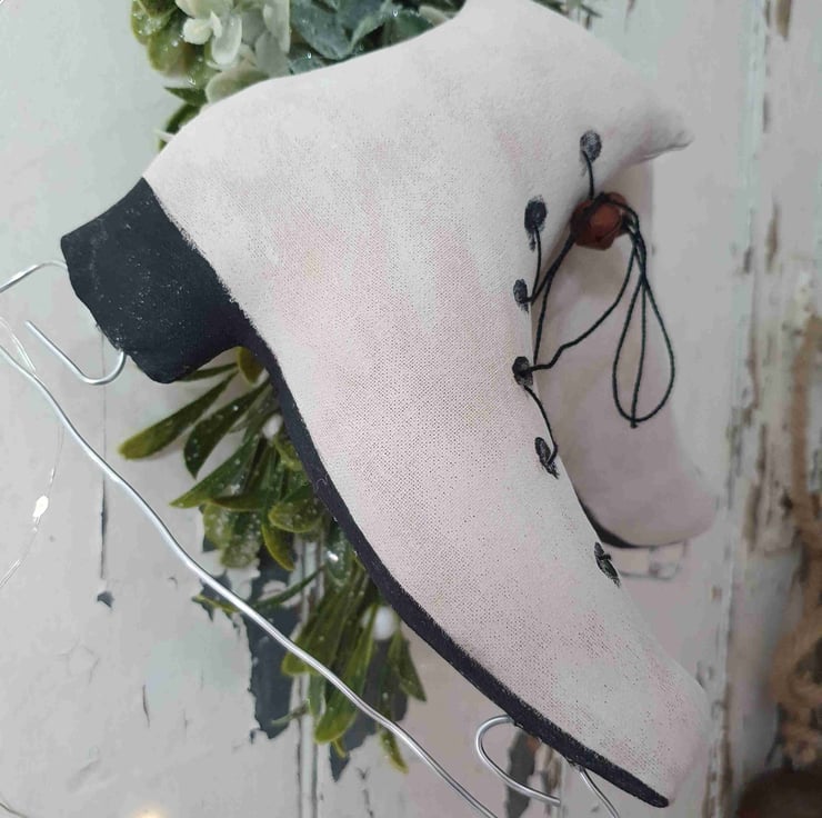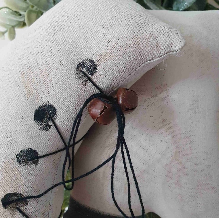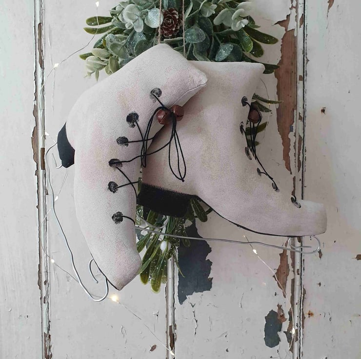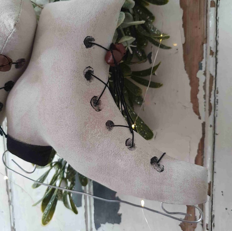 This is a pair of rustic / primitive ice skates that would look great hanging on a door or part of a Christmas wreath. The fabric was first stained with coffee, cinnamon and vanilla. They were then painted with acrylic paint and sanded down. The laces have bells tied to them and the blades have been made out of crafting wire.