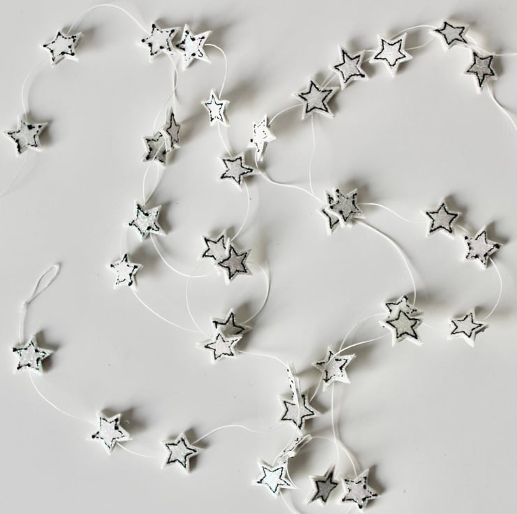 Star garland is created using 100% wool felt, glitter cloth, free hand machine embroidery and is cut out by hand using sharp scissors. The stars are suspended on a linen thread and can be moved along the length, allowing creativity with the spacing.