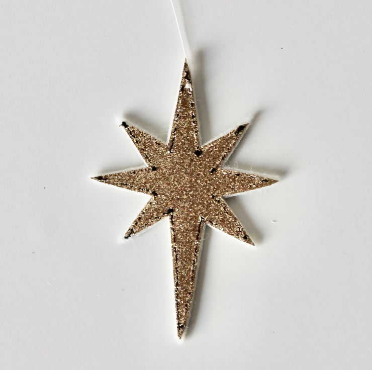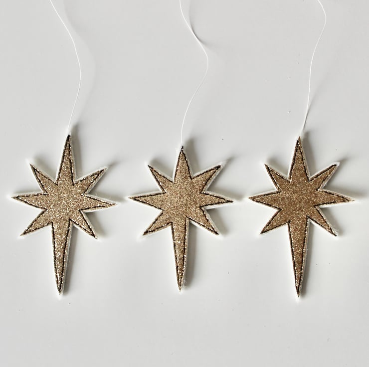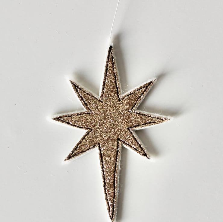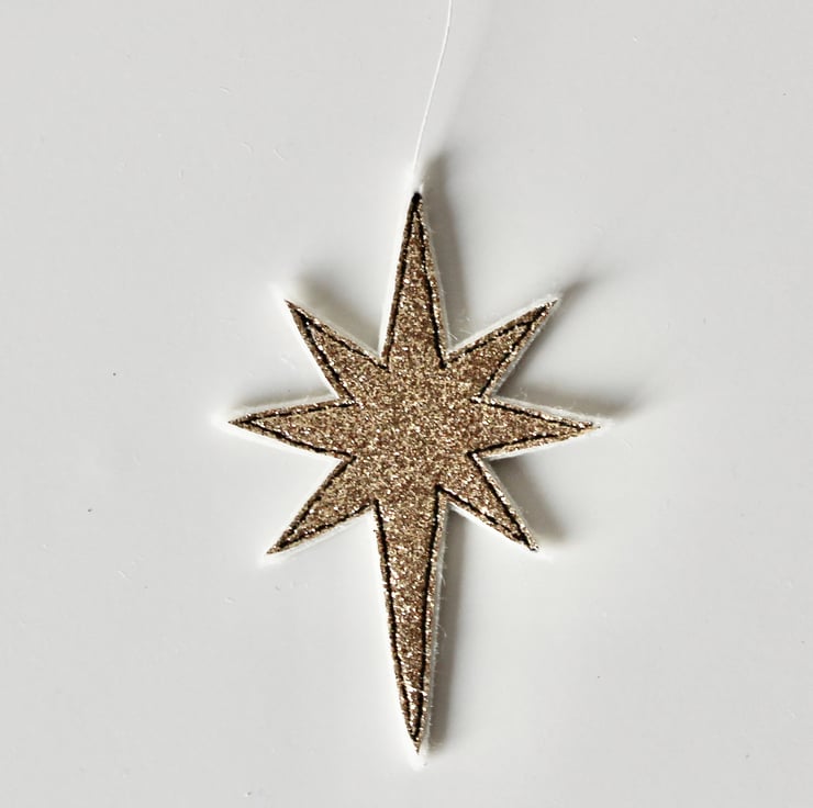 Nativity stars are sewn using a combination of 100% wool felt, glitter fabric and free hand machine embroidery; multiple layers of cloth are sewn together and cut out by hand using very sharp scissors. There is a linen thread to hang.
