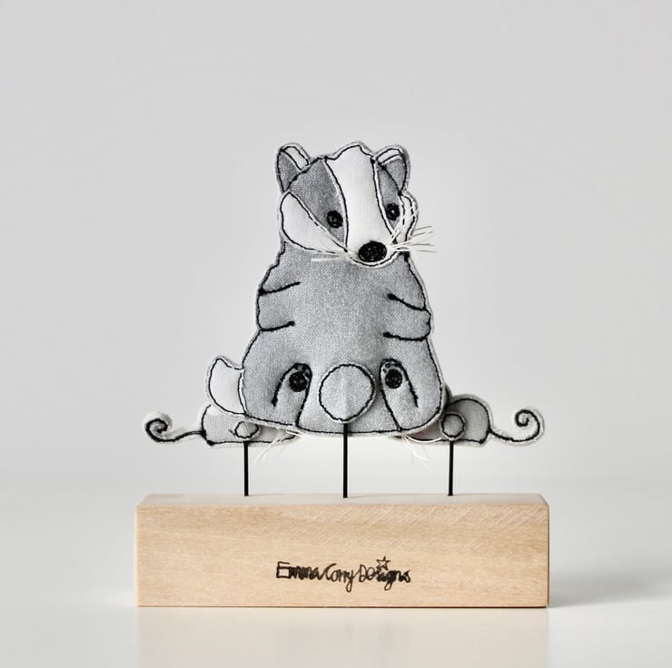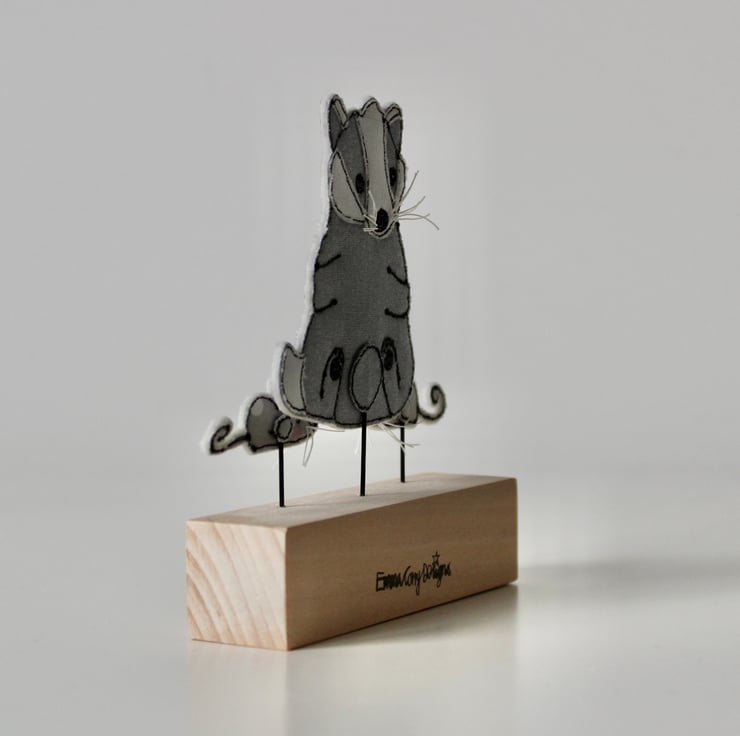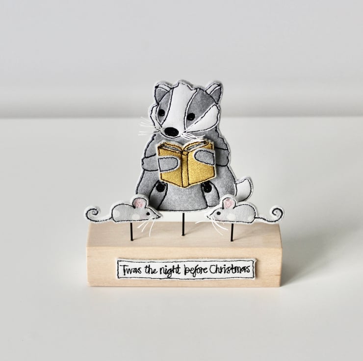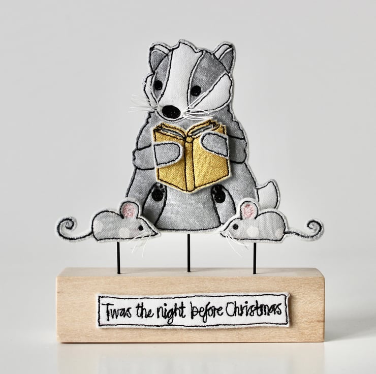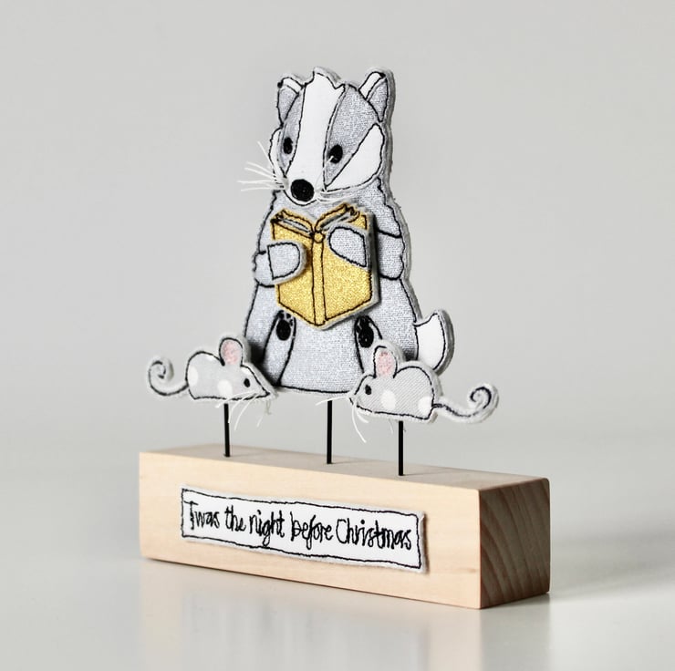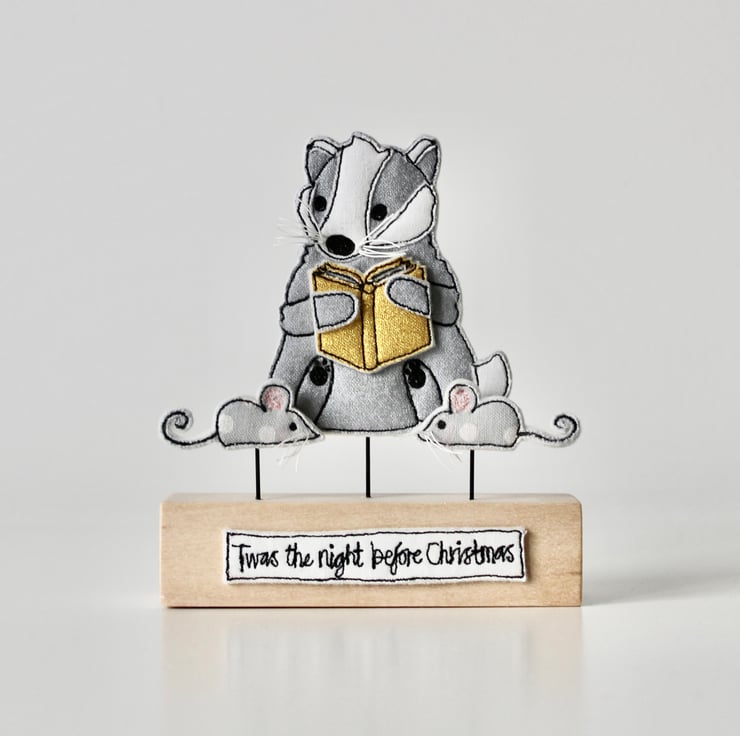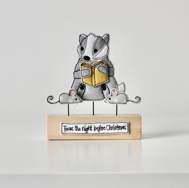 The handmade badger, book and mice are sewn using 100% wool felt, cotton cloth, metallic cloth and free hand machine embroidery; multiple layers of cloth are sewn together and cut out by hand using very sharp scissors. Mounted on a 10cm by 2.5cm wooden length which can adorn a mantle piece or any flat surface.