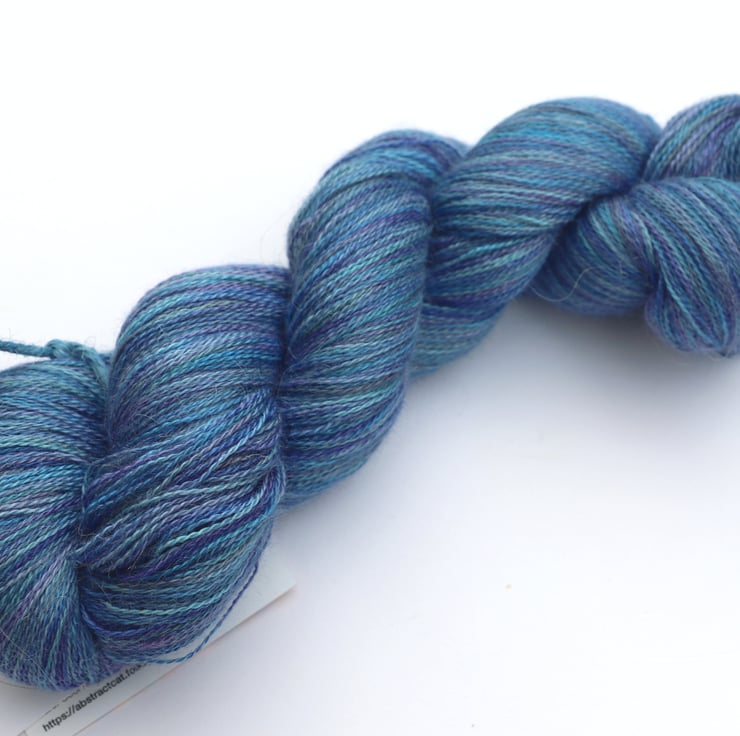 Blue-grey, blue, grey, purple and sea green. This gorgeous and luxurious yarn has the softness and warmth of alpaca with the smooth sheen and cool feel of silk. It should make beautiful lace projects. Photographs have been taken and edited in bright natural light.