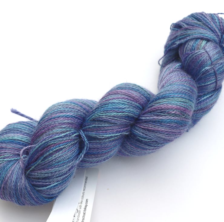 Purple, lavender, blue and grey. This gorgeous and luxurious yarn has the softness and warmth of alpaca with the smooth sheen and cool feel of silk. It should make beautiful lace projects. Photographs have been taken and edited in bright but wintery natural light.