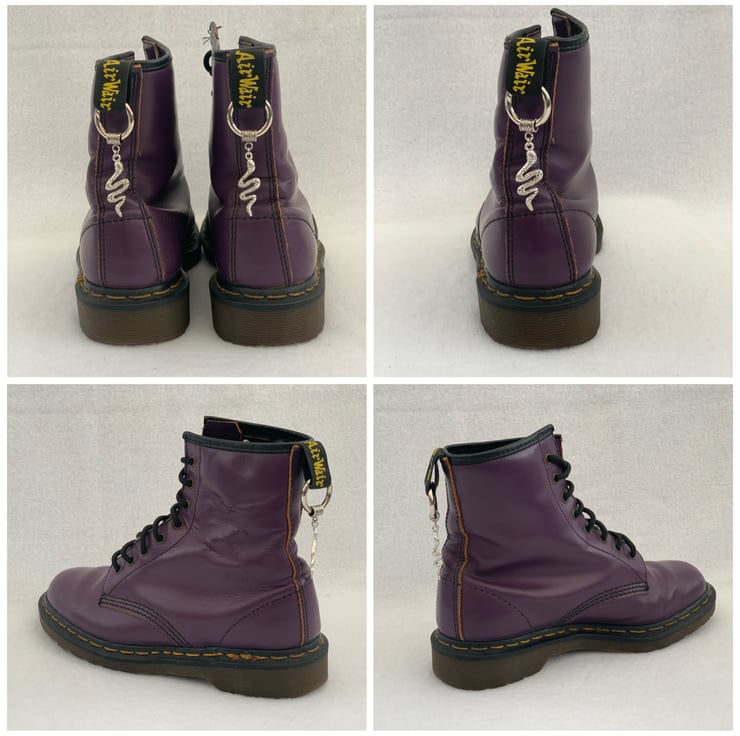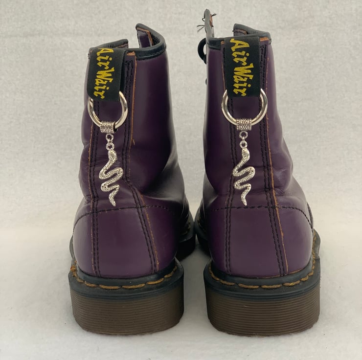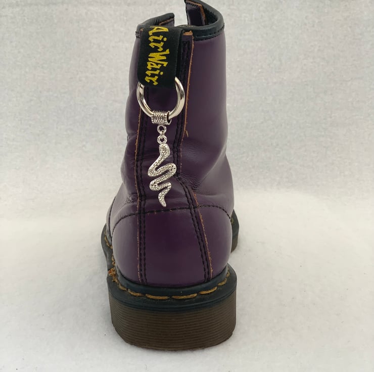 Alloy snake pendant measuring 39x15x2.5mm fitted with a stainless steel jump ring (for strength and longevity) onto a decorative alloy pendant bail and hung from a platinum coloured zinc alloy spring O Rings measuring approximately 27mm outer diameter, 4mm thick with a 20mm inner diameter.
