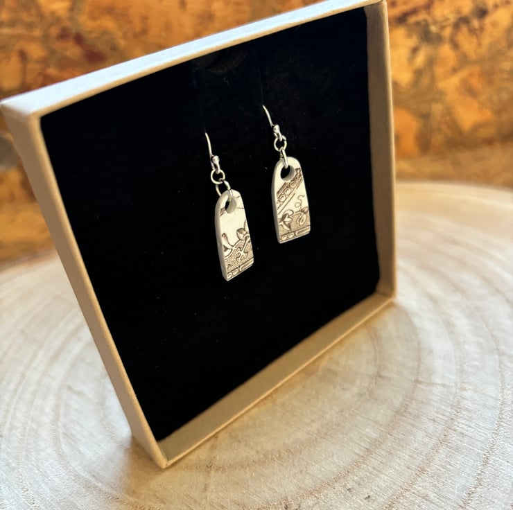 Each earring measures approximately 20 mm x 8 mm (widest) x 2 mm.